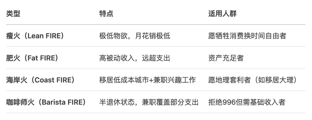 - 核心公式:存够25倍年支出,通过4%年化收益覆盖生活开销。