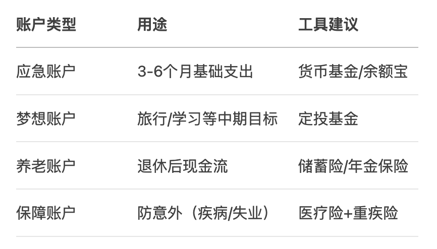 - 建立人生账户,分账户管理:日常、梦想、保障、养老等账户,专款专用。