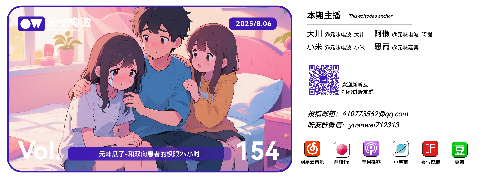 我们的节目,您可以在小宇宙、喜马拉雅、网易云音乐、荔枝 FM、荔枝播客,苹果播客,豆瓣书影音,微博搜索「元味电波」来订阅、收听。如果喜欢我们,也可以分享给你身边的朋友!