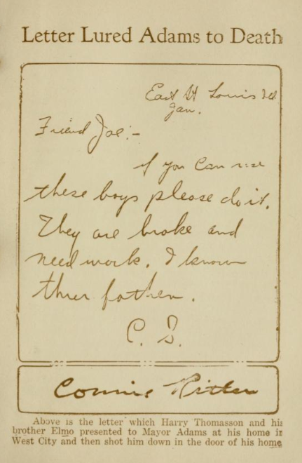 以上是哈里·托马森和他的兄弟埃尔莫在约瑟夫·亚当斯位于西城的家中交给他的信,然后他们在他的家门口将他击毙