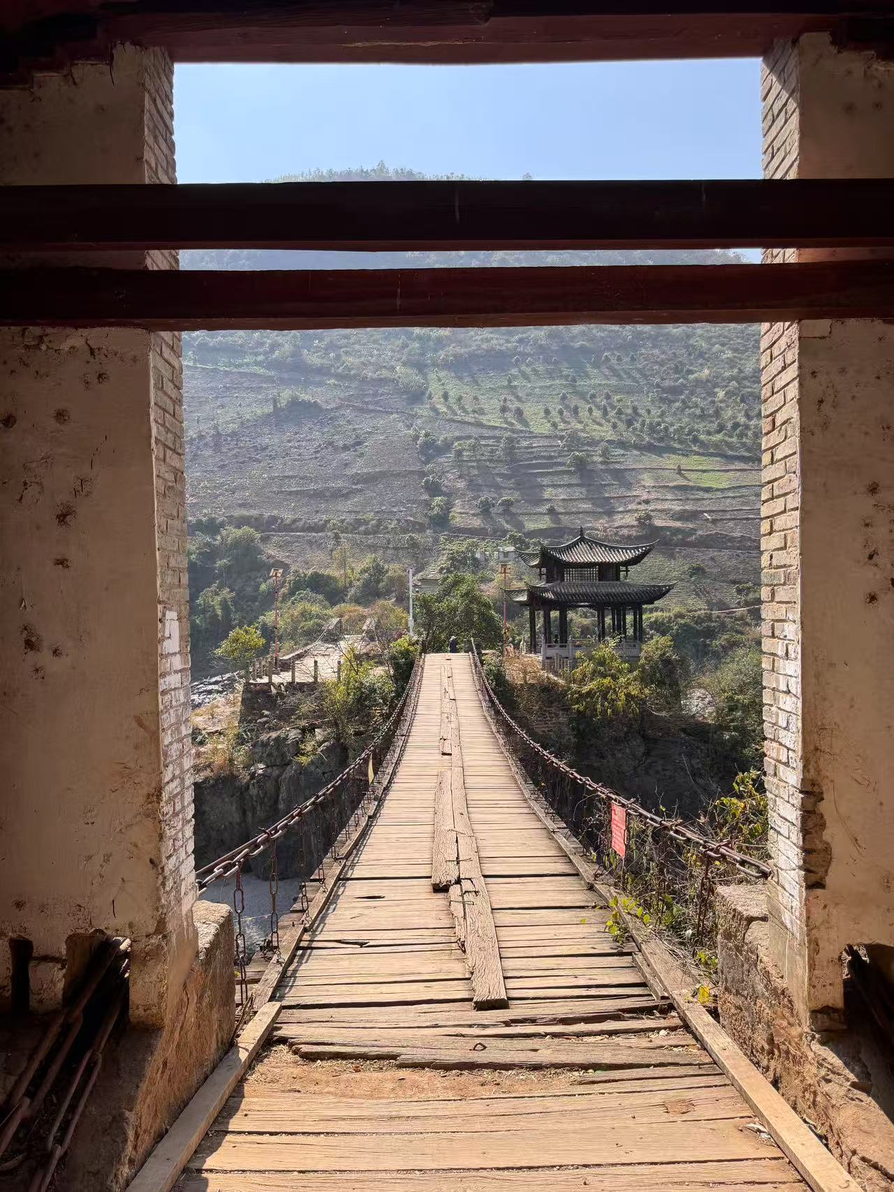 智慧地利用了天然的江心岛,整个双虹桥横架于怒江之上,很自然的分为了东西两部分——冬日的暖阳里,怒江是温柔的碧玉色,但仍然湍急的流水和江边一只牛的骨架,仍暗示着怒江的不逊和温柔下的狂暴,雨季来临,这里必然会是另外一番景象。铁索桥上铺着随时可以撤掉的木板,晃晃悠悠,吱吱嘎嘎,当地人的摩托在上面通过,也全然不会有减速的迹象——撤掉木板,这里是当年滇西阻击战的前沿,成功地阻击了日军的进攻;铺上木板,这里是滇西反击战的第一枪,也是如今两岸赖以交通的通途。