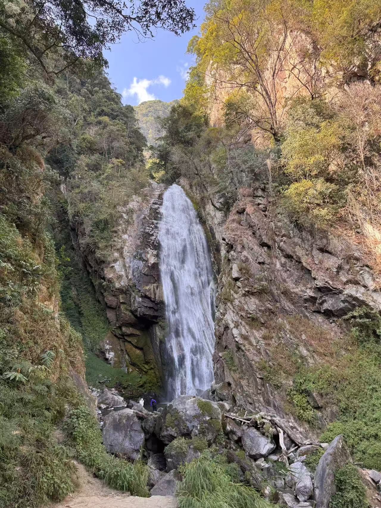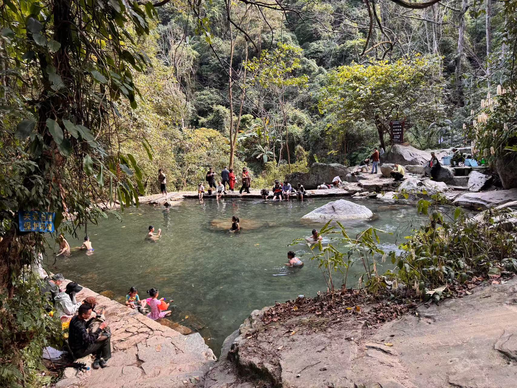 然后便是百花岭了。过了防火检查站,山路略有些崎岖,但好在不远处就到了徒步起点的停车场——从这里开始就是百花岭的5公里环线,如果顺时针走,便会一路欣赏到瀑布和绝美而丰富多变的景色后,于2/3处路遇野温泉,这简直是巨大的惊喜!有所准备的便去换泳装,毫无准备的也绝对忍不住泡泡脚的诱惑——有的阿姨还带来了鸡蛋,不得不说是真的有生活的经验和智慧了,我等艳羡!