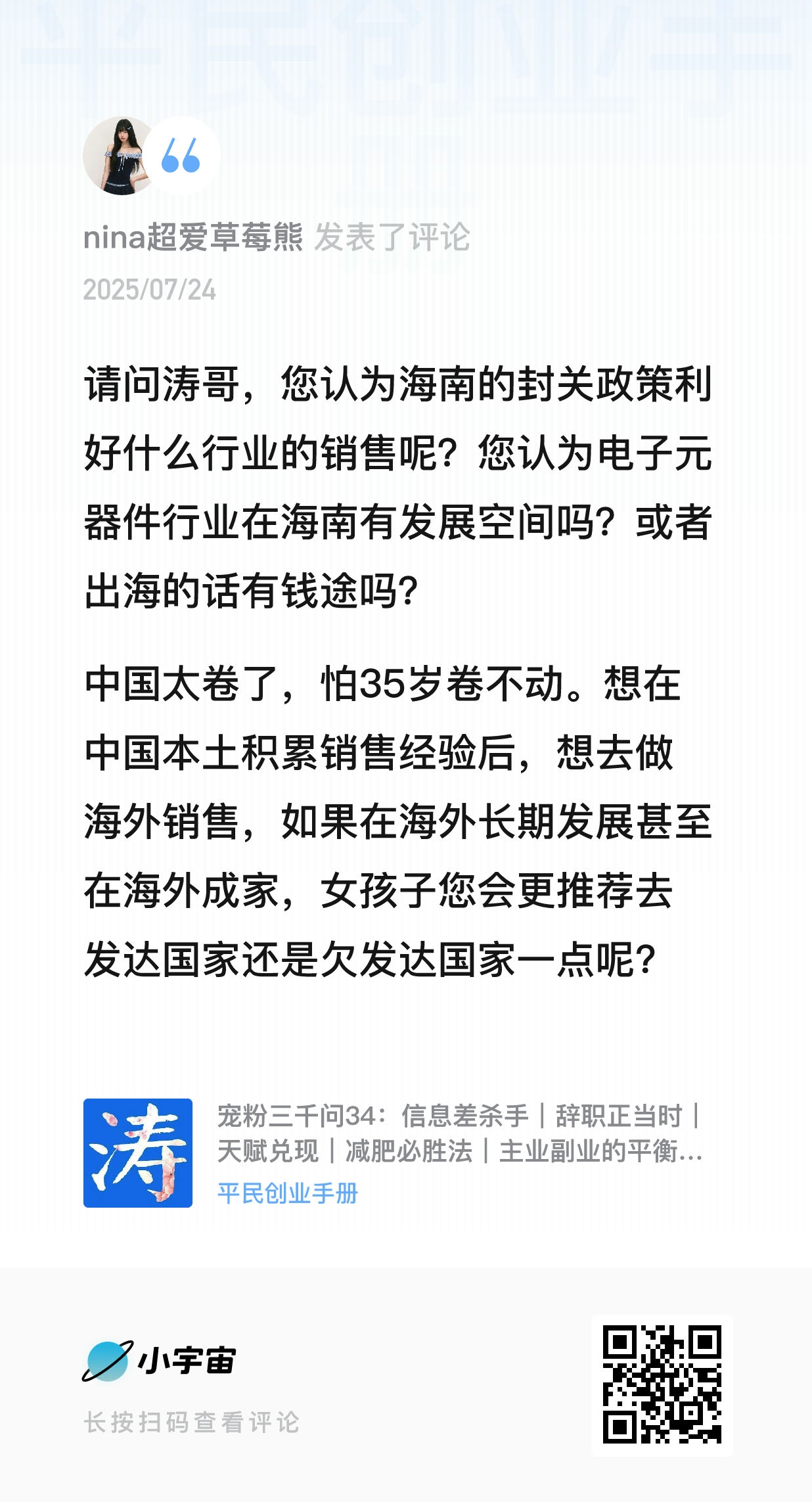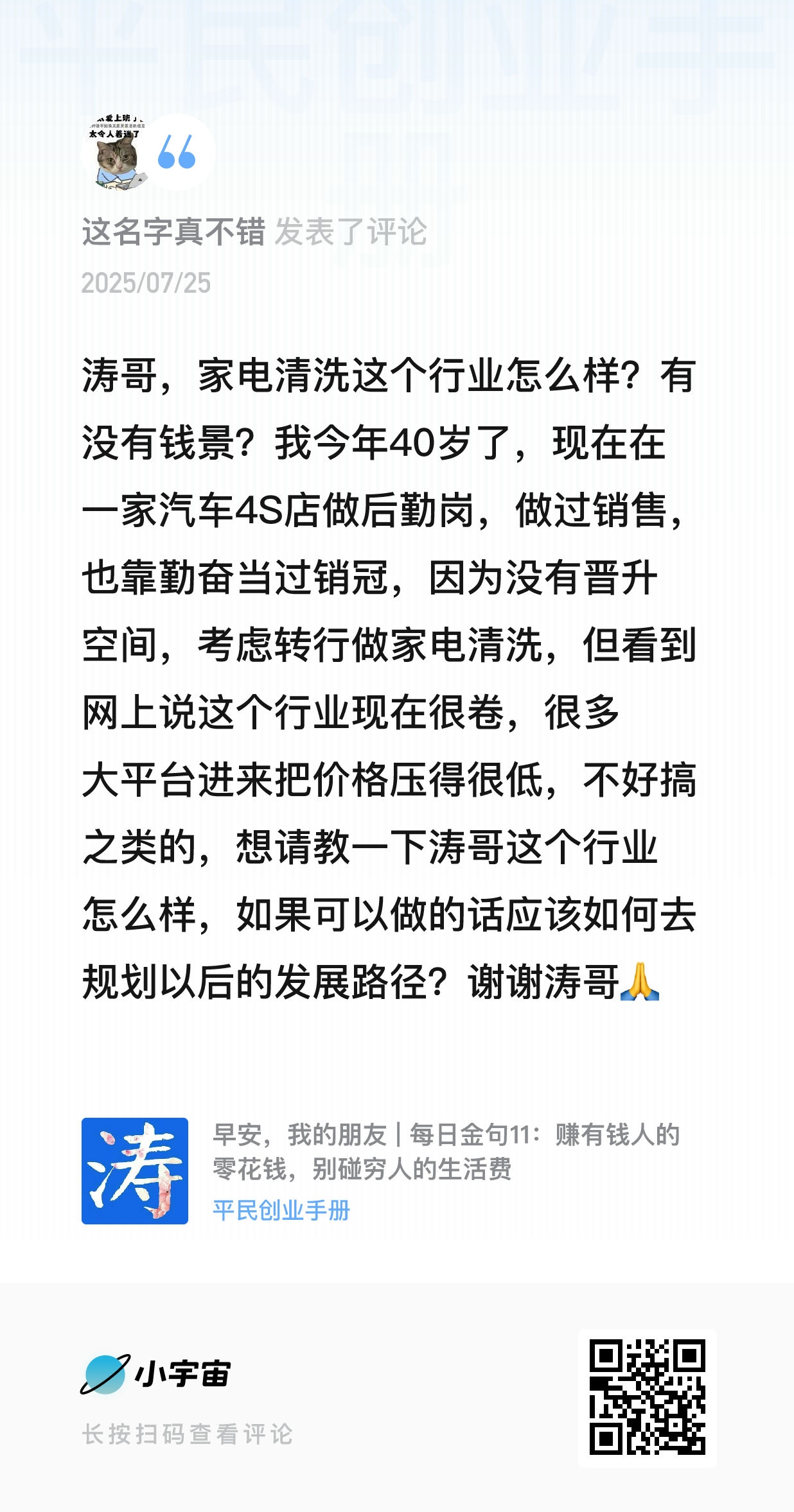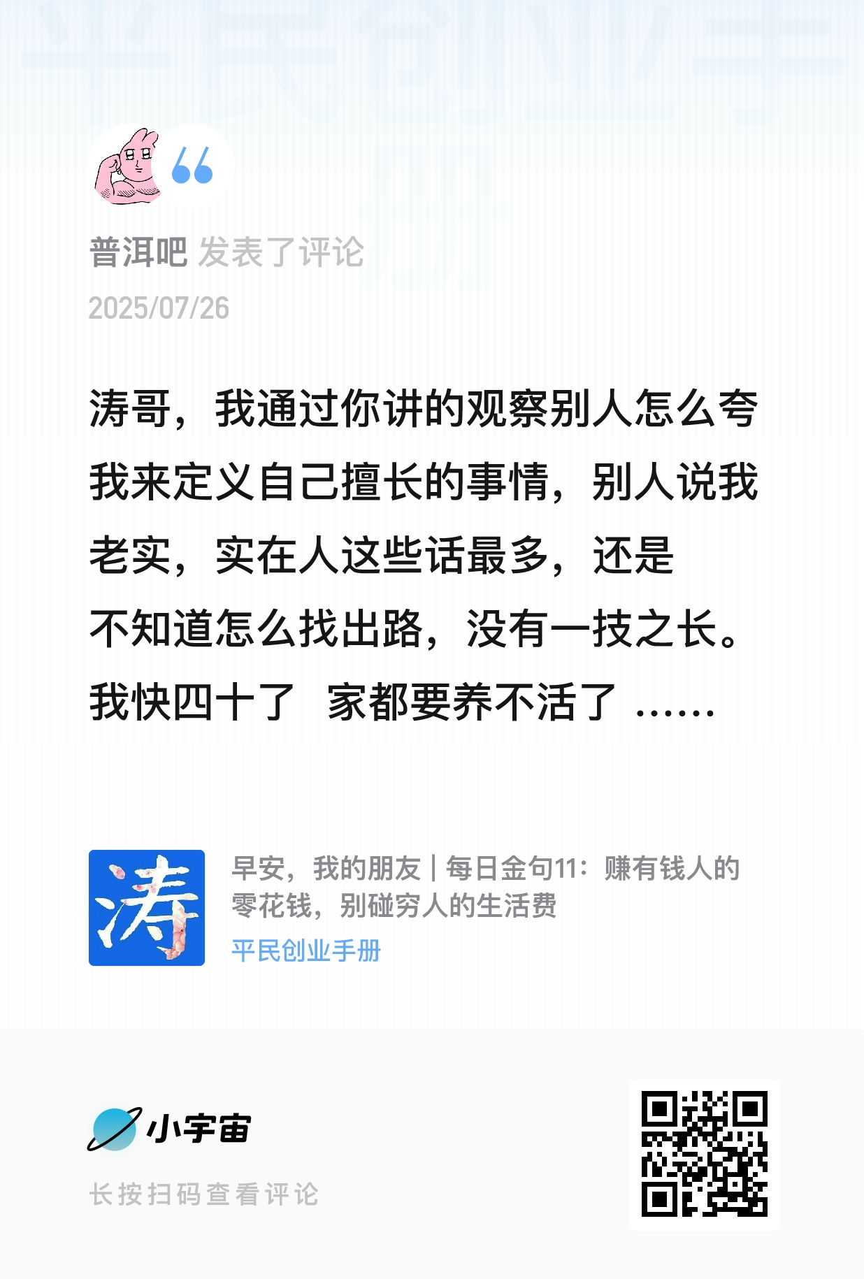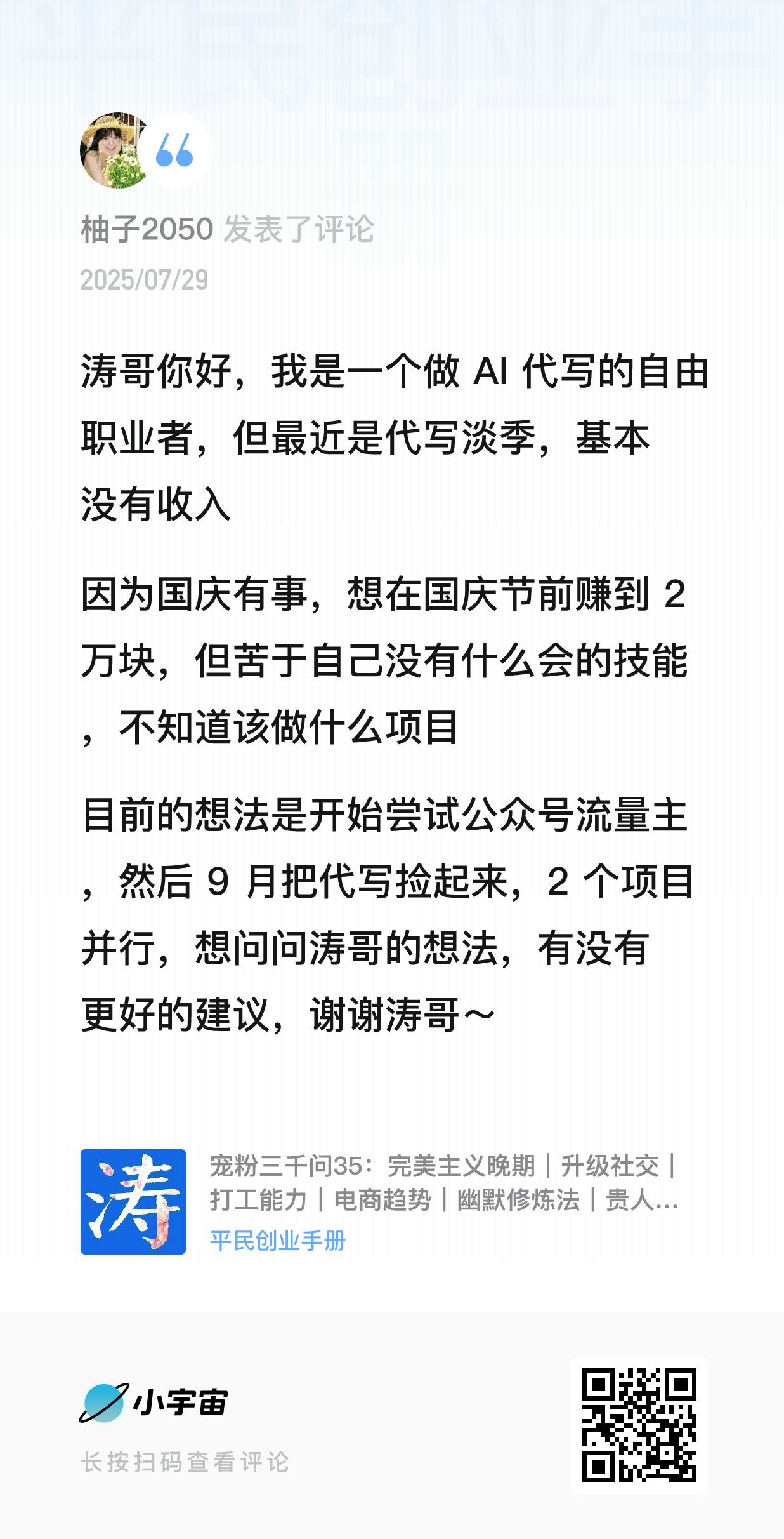 我的微信:xuejieyou6,欢迎撩我,我在「屋里涛说」等你,来星球《平民创业手册》有问必答,