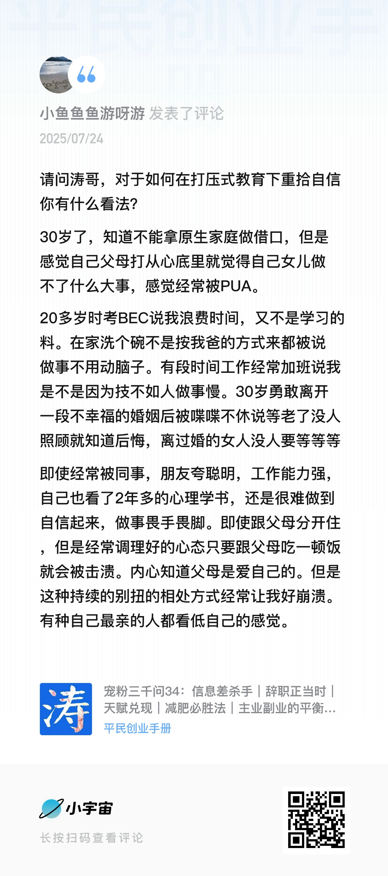 - 12:45 Q4:从小面临家庭PUA式教育,如何重拾自信?