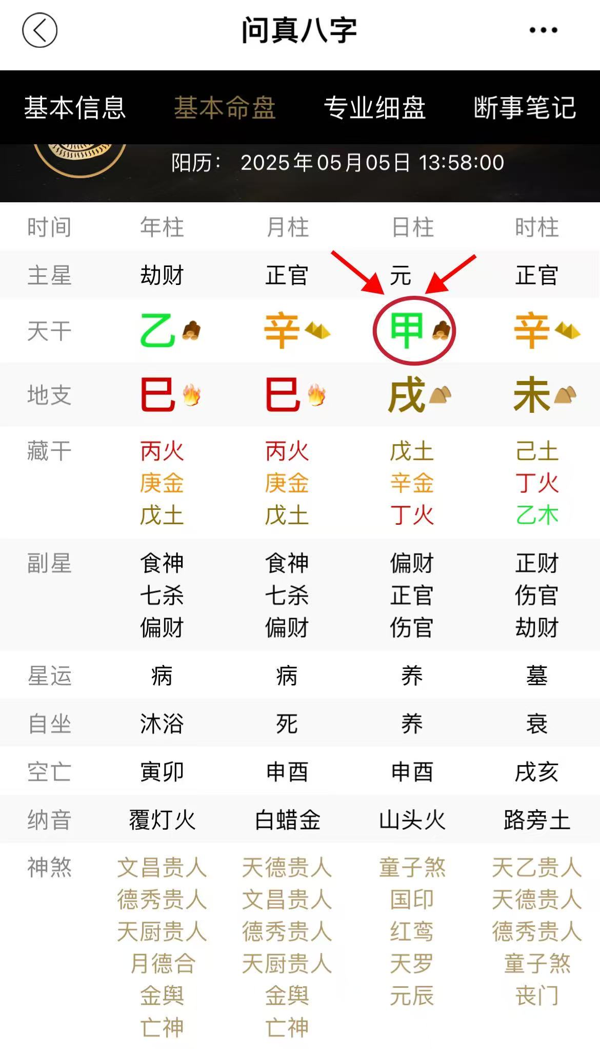 打开问真八字或任何一款命理APP,将自己的出生年月日时输入后,得到如下盘面,日柱的天干(第三列第一排),即个人八字的日元(见下图案例)