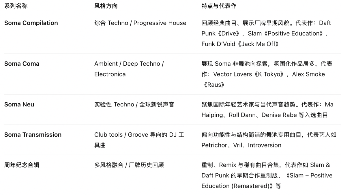 Soma Quality Recordings 的合辑(Compilation)板块在其厂牌历史中占据了非常重要的地位,它不仅记录了 Soma 的声音演变,也反映了 Techno 与电子音乐在不同年代的发展轨迹。通过不断推出精选合辑,保持其声音的多样性与技术性之间的张力。