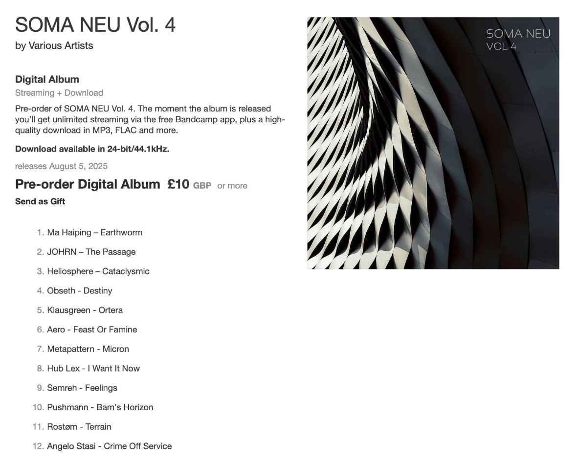 2025年 Soma 推出 SOMA NEU 系列第四辑,延续了厂牌自创立以来对高品质电子音乐的执着追求。收录 12 首震撼作品,涵盖迷幻、深邃、催眠的极简音色,到更为强硬激烈的 Techno,再次展现 Soma 对当代声音动向的精准把握。