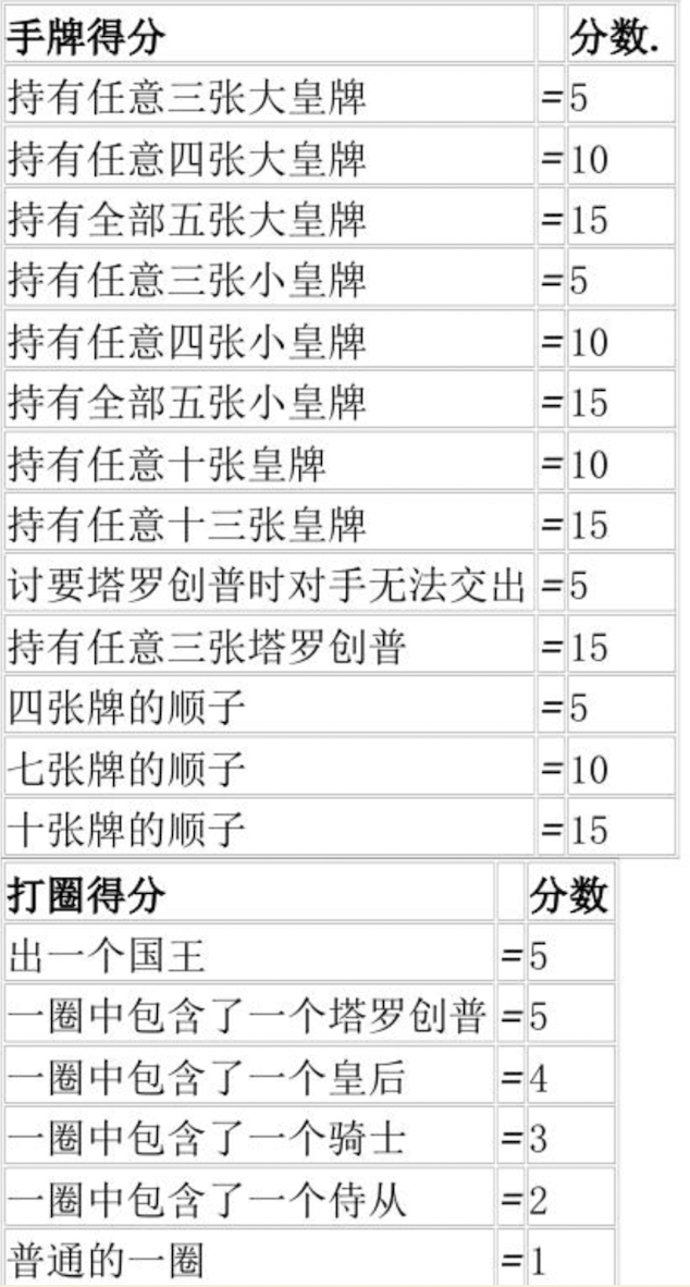 如果玩家有塔罗创普中的任意两个,他可以向自己的对手讨要一个塔罗创普.如果后者不能提供,前者便可得 5 分;但如果后者有的话,他必须把这张牌交给讨要者,之后这个讨要者不会得分,但讨要者必须给对手一张价值小的牌作为交换.对每 3 张你所持有的塔罗创普,你可以得 15 分.