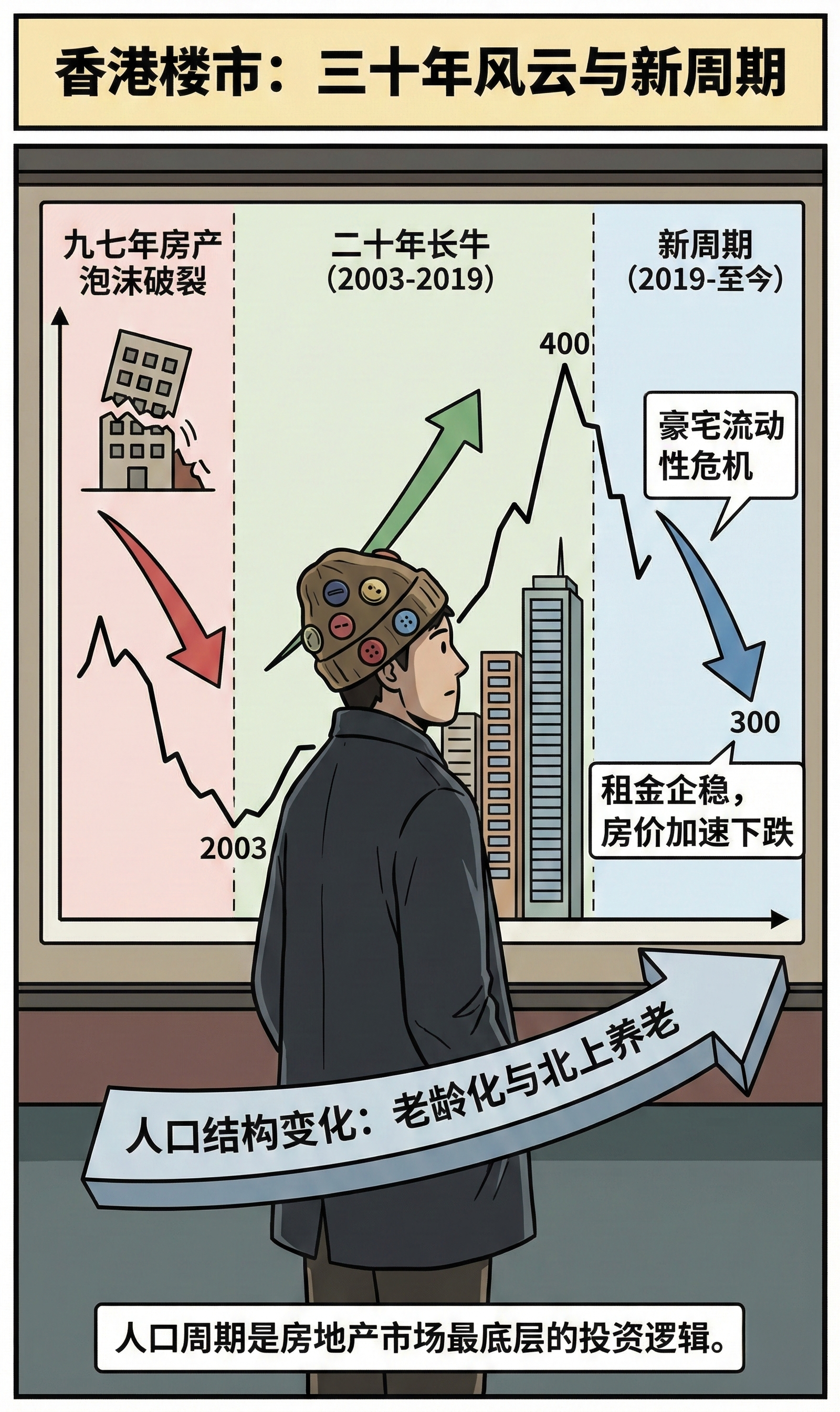 本期内容深入探讨了香港房地产市场的现状及其背后的人口变化因素。香港房价自2019年以来持续下跌,平均跌幅约30%,部分豪宅价格甚至跌回1997年水平。人口老龄化和劳动人口减少是影响房价的重要因素,同时,港人北上大湾区养老的趋势对香港房地产市场产生了显著影响。此外,香港商业地产的流动性下降,租金回报率下降,开发商面临债务风险。本期内容强调,未来房地产投资策略应考虑流动性问题,而非仅仅关注价格涨跌。