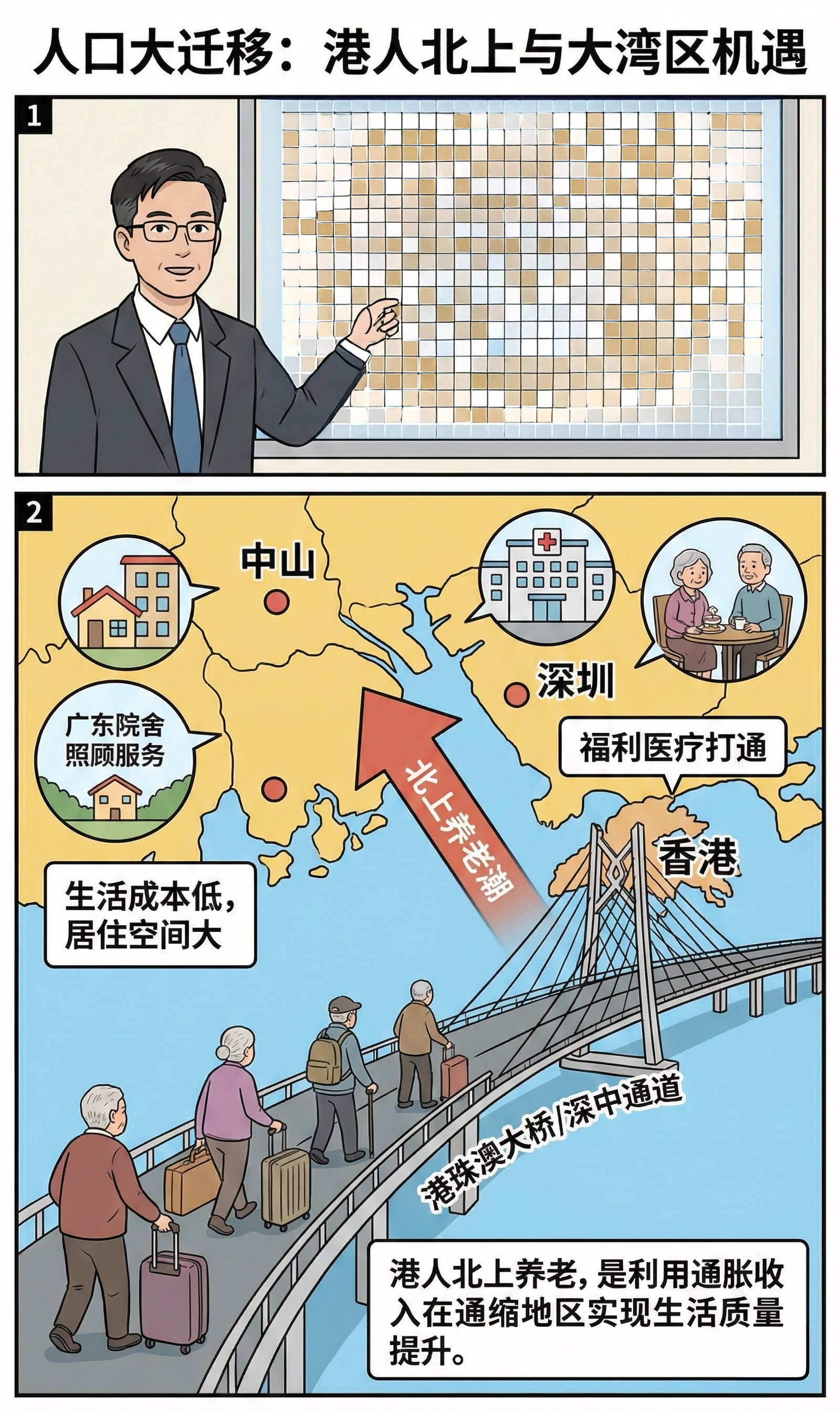 分析了港人北上养老的现象,探讨了大湾区对香港老年人口的吸引力,以及这种人口流动对香港房地产市场的影响。讨论了香港老年人口在房地产市场中的角色变化,以及他们对香港商业地产可能产生的冲击。