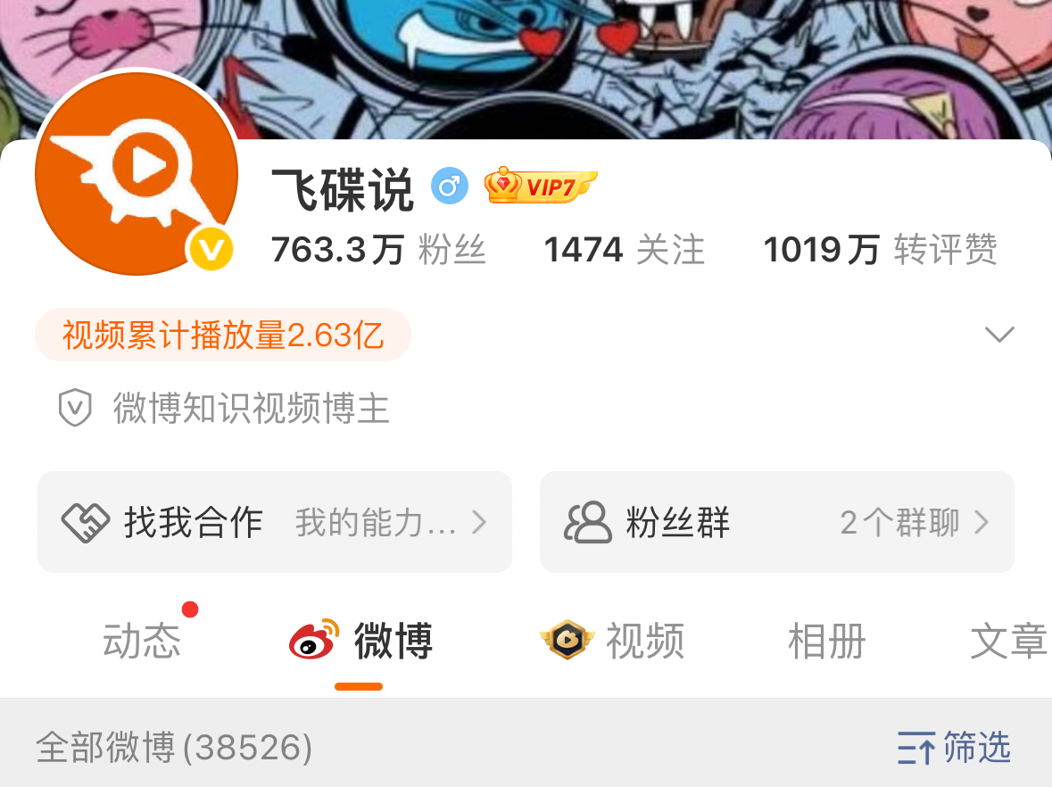 策划配音《飞碟说》系列百科视频全网用户数超千万,播放量超300亿次。