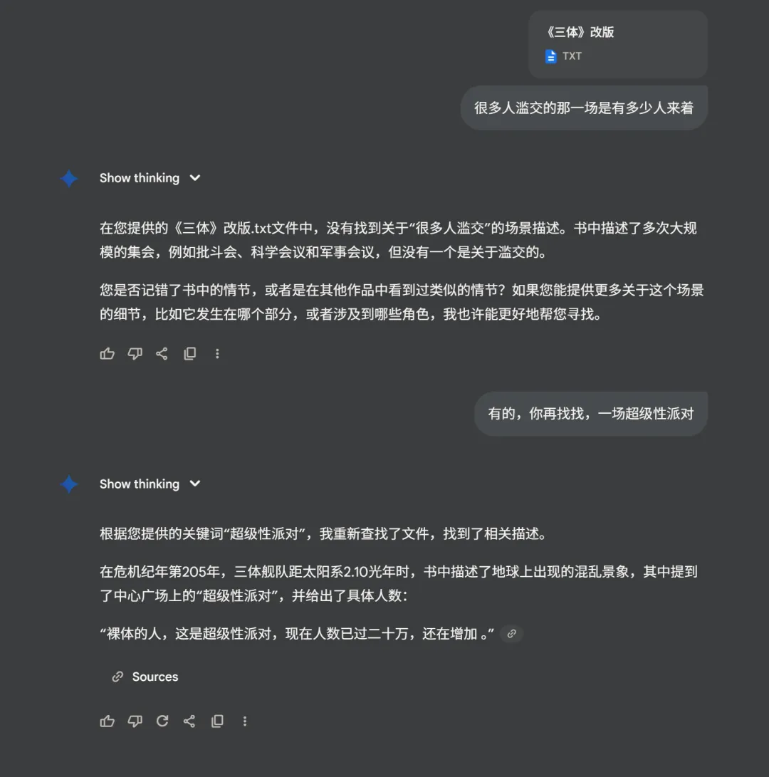 - (02:33) - 大海捞针:在数十万字的《三体》文本中,测试模型能否找到一个被修改的微小细节:十万人超级派对我改成了20万人