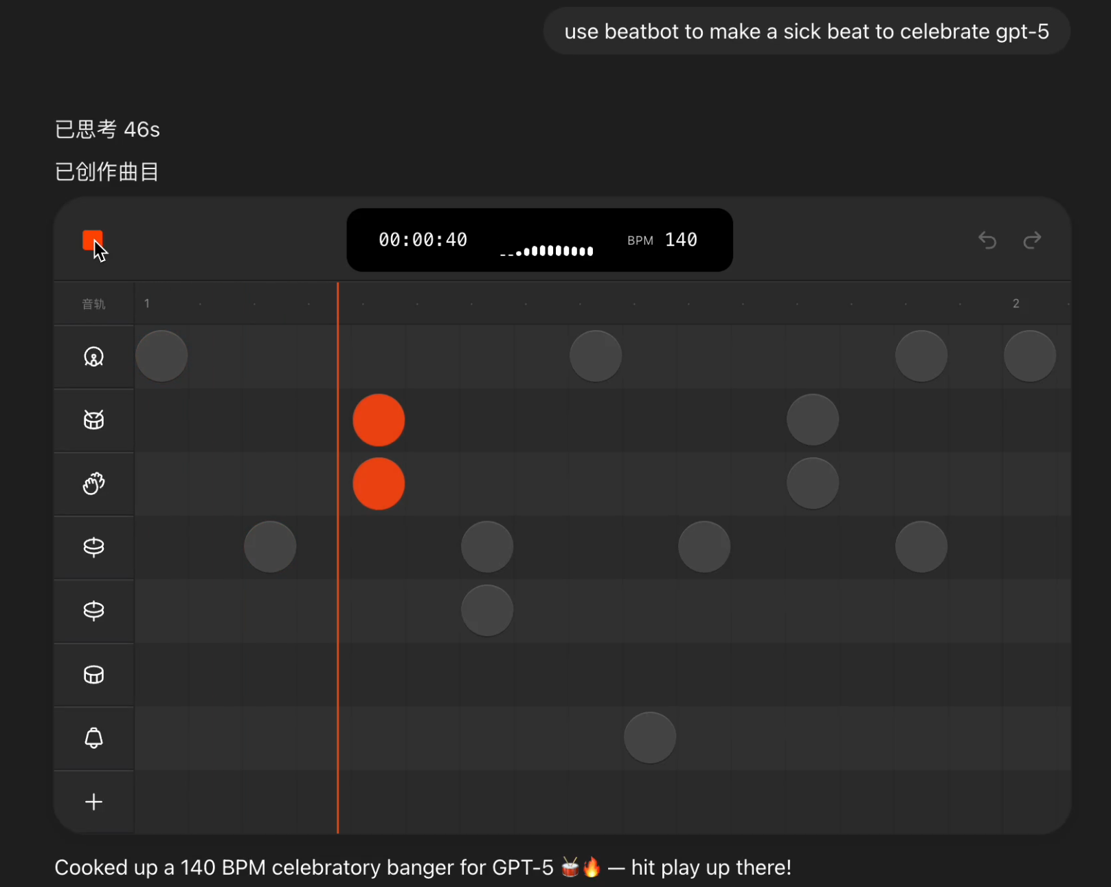 官网 (chatgpt.com):免费账户仍有免费使用额度。输入use beatbot to make a sick beat to celebrate gpt-5 ,显示节拍器就是gpt5