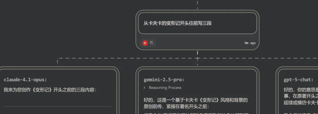 - (21:13) - GPT-5 的表现:文笔精妙,成功捕捉到了卡夫卡式的神韵,对主角变成甲虫前的心理状态和环境进行了深刻的描绘。