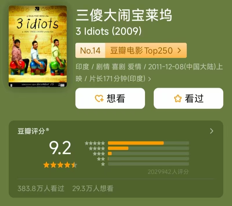 本期影片:《三傻大闹宝莱坞》(《三个傻瓜》)