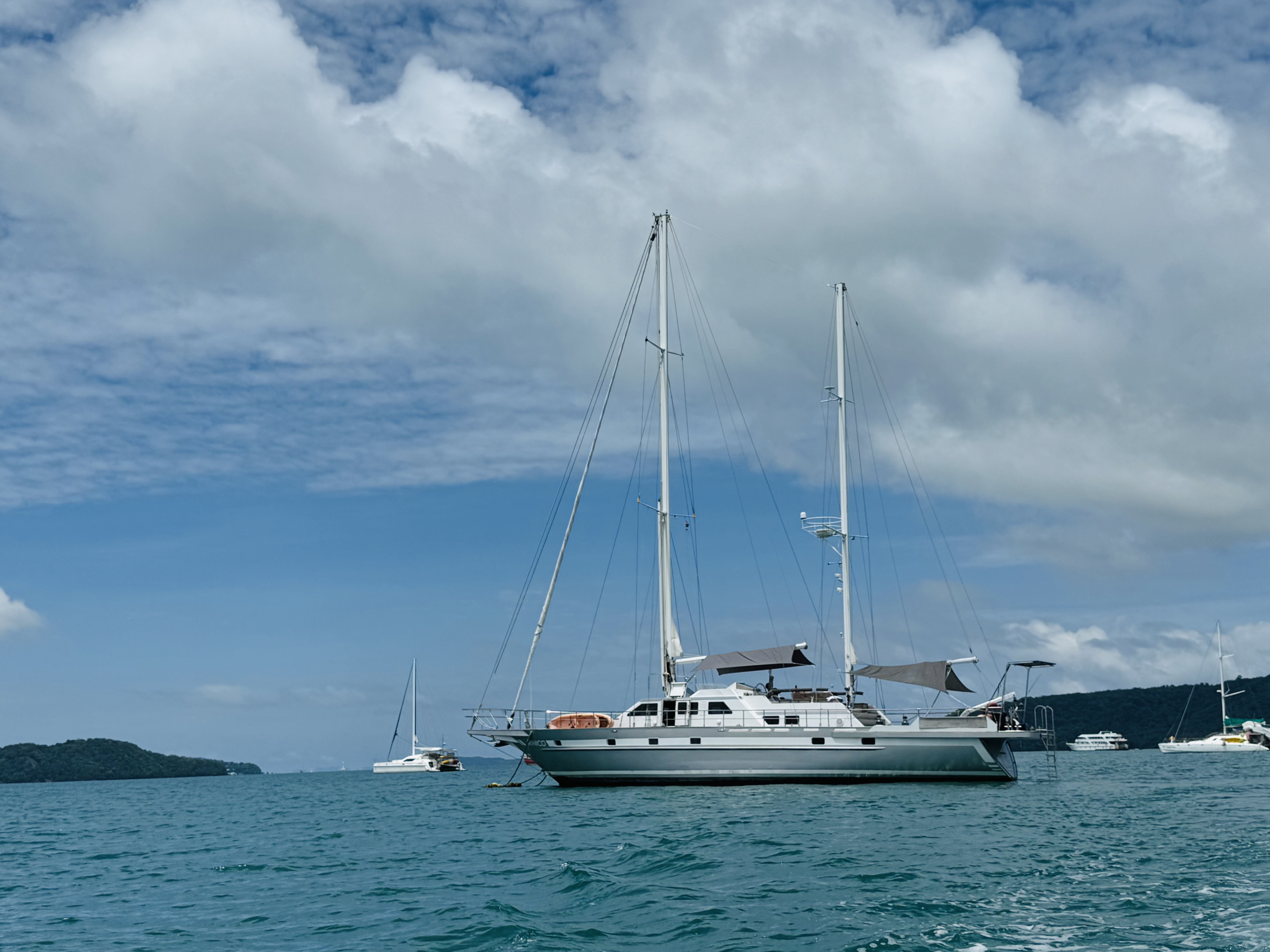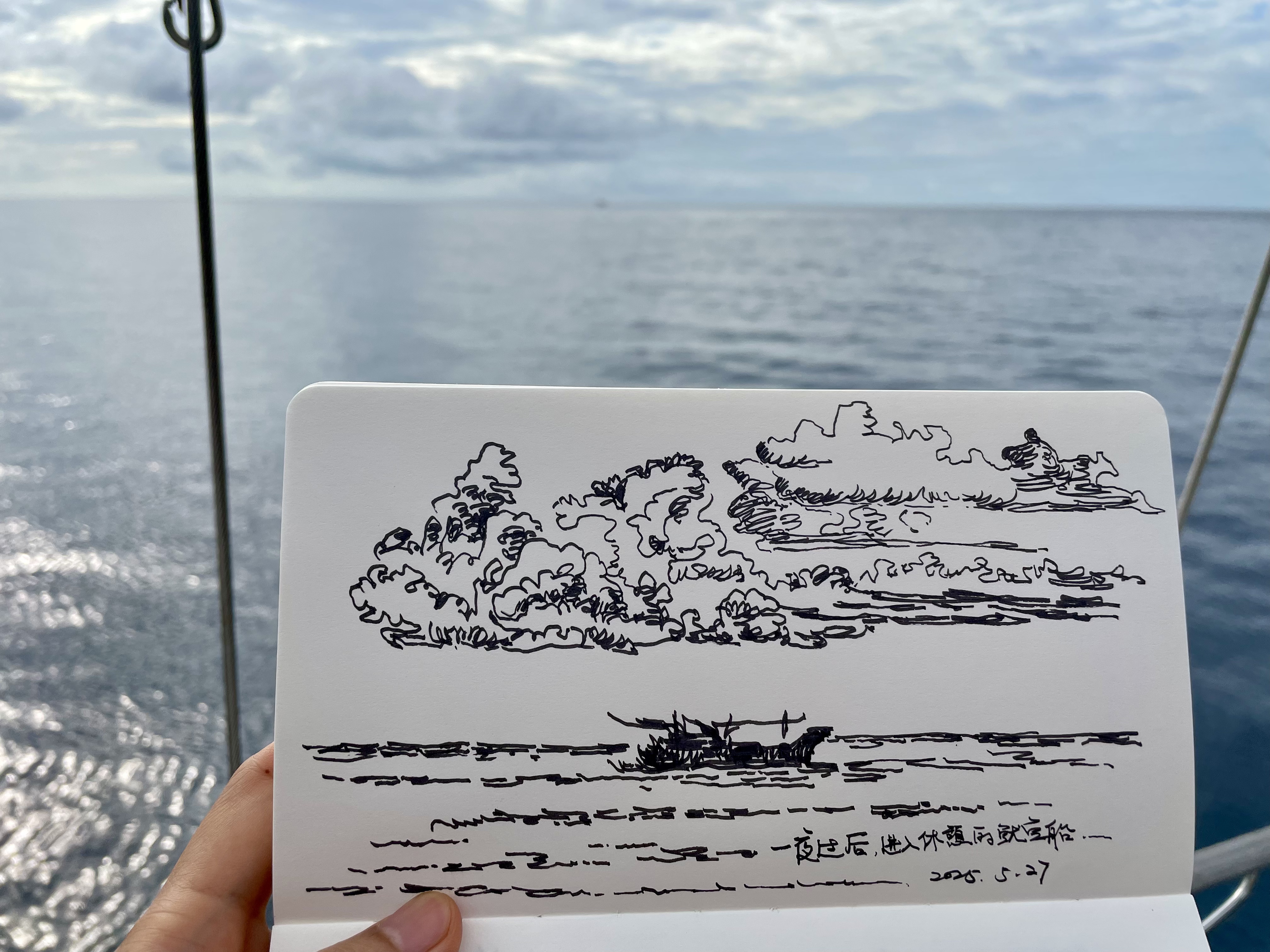 那几日我们不再登岸,吃住在船上,傍晚在无人岛边下锚,夜里睡甲板,浪花伴我们入眠。出了海,我们就真成了「一只船上的蚂蚱」,整个大海上只有这一叶扁舟,而我们只拥有这艘船和彼此了。