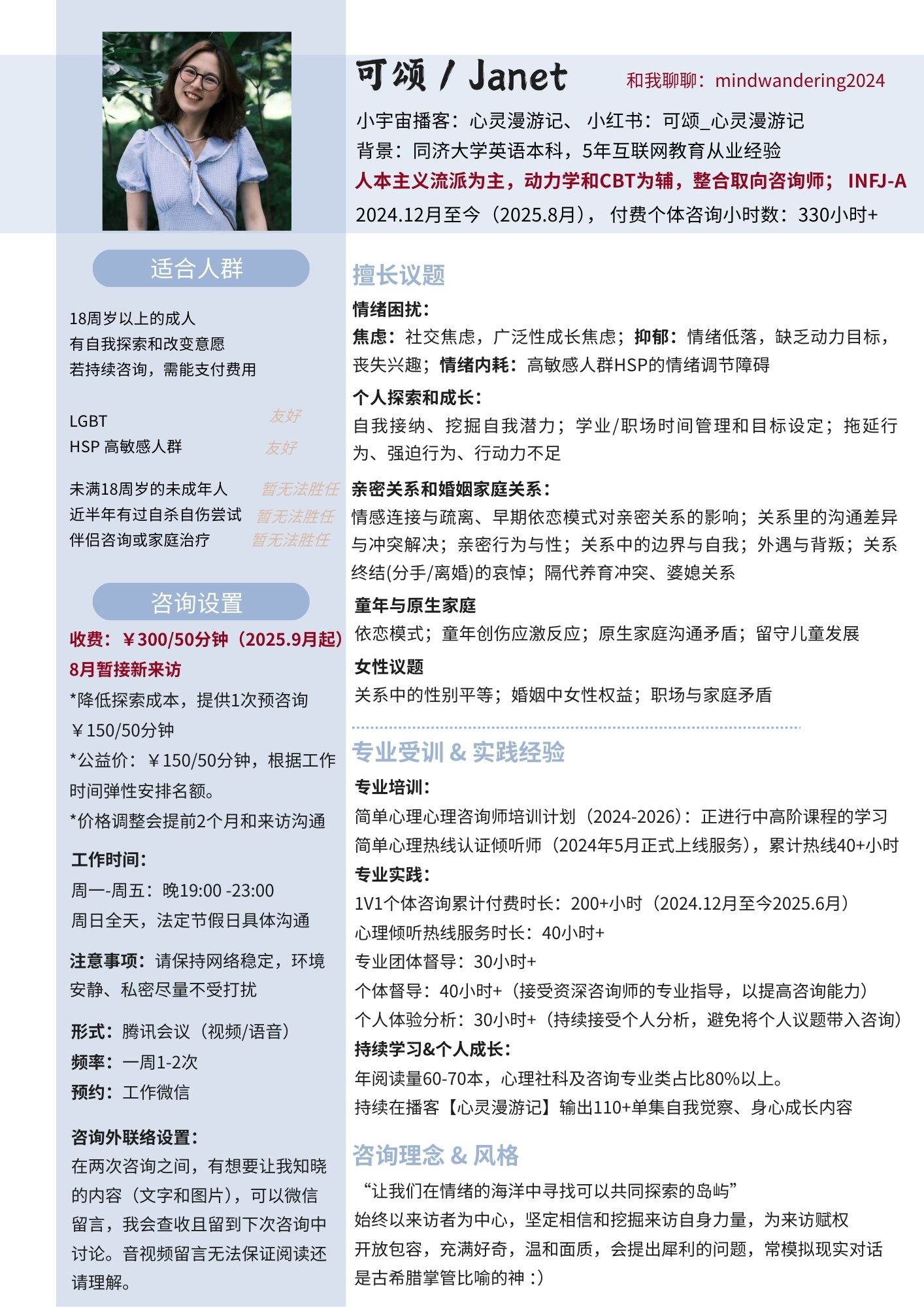 可颂是一名心理咨询师,目前累计咨询小时数330+小时。如果你想要找个人聊聊,可以添加工作微信【mindwandering2024】,请备注“心理咨询”。服务介绍海报请见文末。
