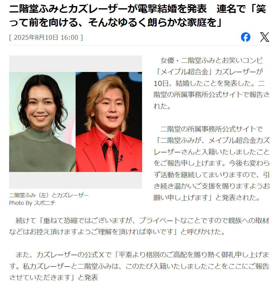 - 据日媒报道,二阶堂富美(31) 和搞笑组合“枫超合金”的卡兹雷泽(42)今日宣布结婚,表示已正式登记入籍,并将继续各自的演艺活动。他们联名发表声明:“笑着向前看,打造那样轻松愉快的家庭。”还呼吁媒体和公众给予空间,不要打扰双方亲属。