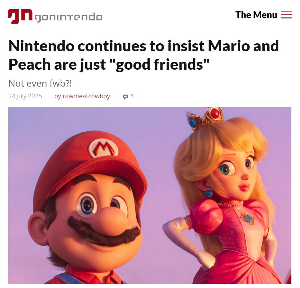- 任天堂官方NINTENDOTODAYAPP英文版近日更新介绍称「碧姬公主和马里奥两人是好朋友,会在彼此需要时互相帮忙」、一些外国网友因此破防。