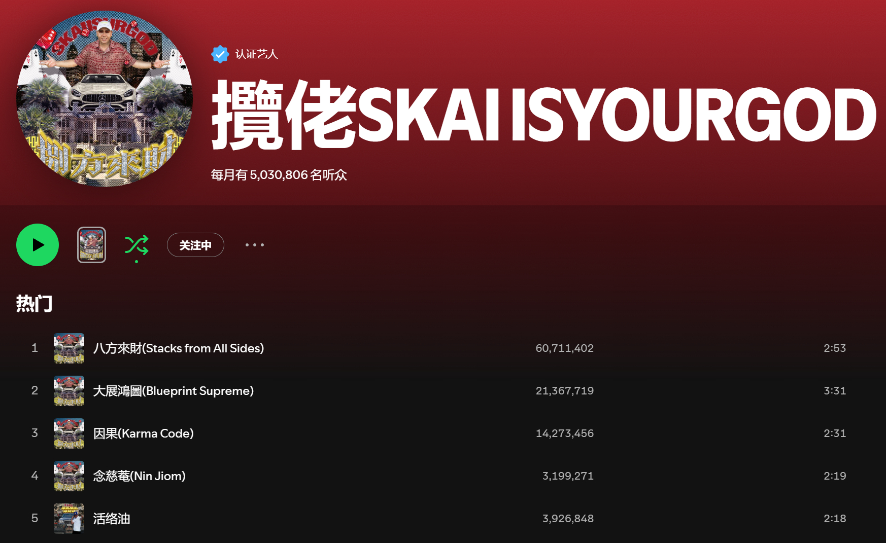 - Spotify播放量破亿!《八方来财》版权收益揭秘:揽佬SKAIISYOURGOD税后收入134万。