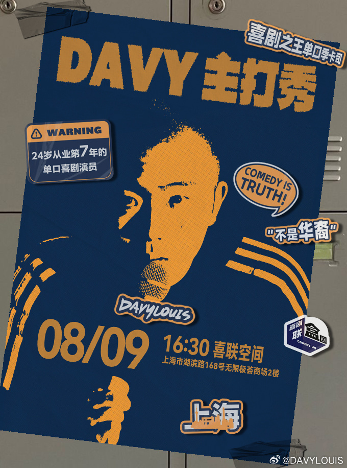 《DAVY主打秀》也正在全国演出中,如果来到你的城市,欢迎您到线下,感受DAVY的喜剧现场。
