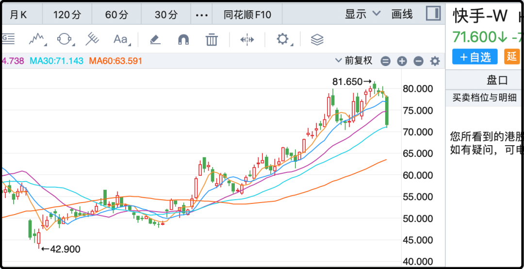 4、快手今天暴跌9%,把过去一个月涨的都吐回去了。原因是他们跟美团合作,杀入外卖领域,其实就是把平台流量导给美团,流量变现。但市场对此反应激烈,现在外卖行业内卷已经臭大街了,全国人民都知道里面角力的几方都在流血拼消耗,这个时候快手进去掺合一脚,市场认为外卖合作是流量低效变现,就开砸了。我真服了,至于嘛砸这么狠,外卖业务现在真的是狗都嫌。我本来还盼着快手涨回ipo发行价,今天真是迎头痛击。