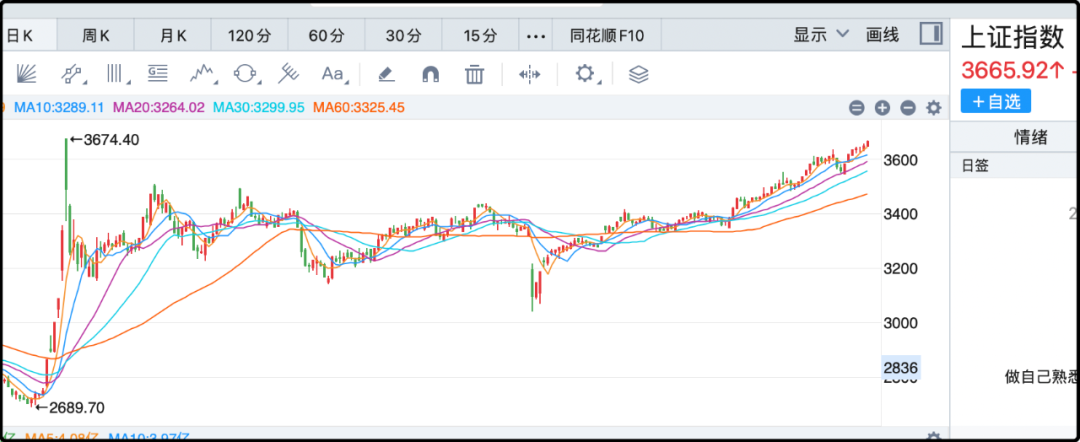 4月初那波关税战引发的暴跌像是突然打通了a股的任督二脉,开窍了,几十年没学会的美式慢牛突然就会了。之前有人不理解为什么美股可以没完没了涨个不停,现在体会到了吗,就是这种感觉,慢悠悠向上拱,权重股硬邦邦,各个板块轮动发力,回调都是错开的,或者在日内,偶尔跌一下也能在中期均线上兜住。涨了4个月了,没有乖离也没有超买,均线形态很健康,没毛病。