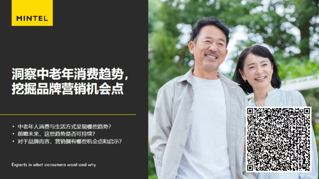随着“年轻老人”概念的兴起,我们看到中老年人的生活方式正在发生显著变化。他们不仅关注健康和长寿,更积极追求精神充实和社会参与。在不久前的网络研讨会中,英敏特专家解读了中国中老人群偏好与生活方式,解读三大人群趋势,挖掘品牌营销机遇。您可以扫描以下二维码免费收看专家解读视频。