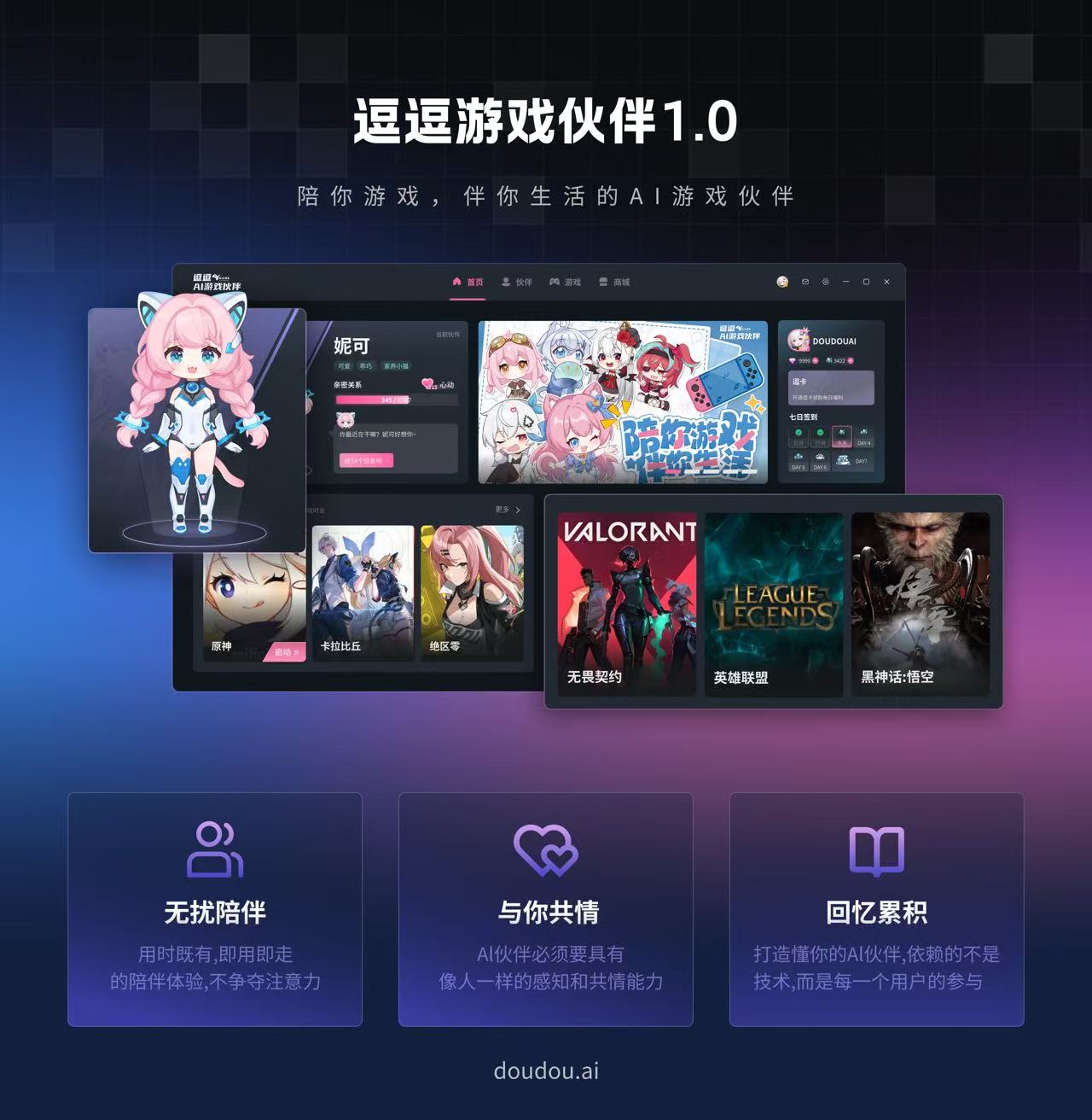 🌟 逗逗 1.0 全新版本将在8月18日正式上线,从"游戏助手"到"生活伙伴",在过去一年多的测试阶段已积累超 800 万注册用户,测试期高达 70% 以上的次日留存率,逗逗团队以极致耐心深耕用户需求,每一处功能优化都源自对用户行为的深度拆解与反馈倾听。逗逗游戏伙伴是“用户参与共创”的诚意之作,欢迎登陆官网 doudou.ai 下载体验!