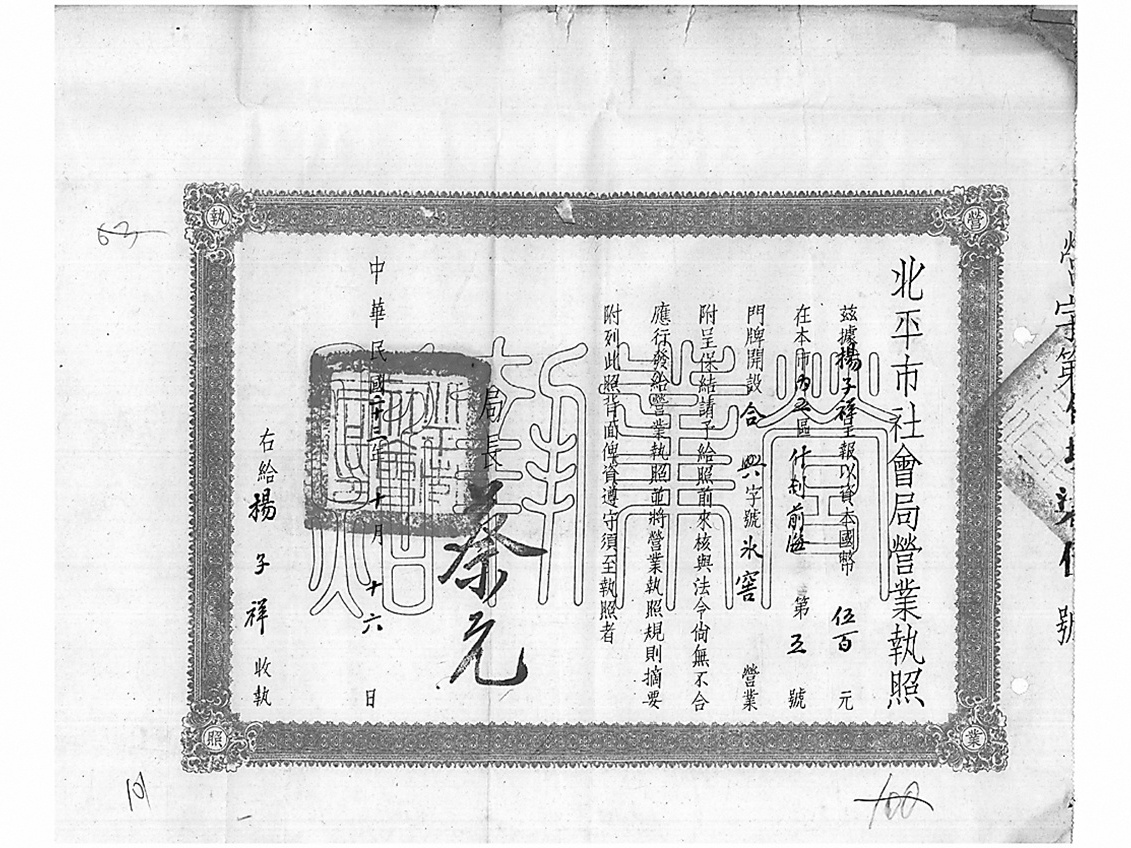 ►1934年10月,北平市社会局颁发给合兴冰窖的营业执照