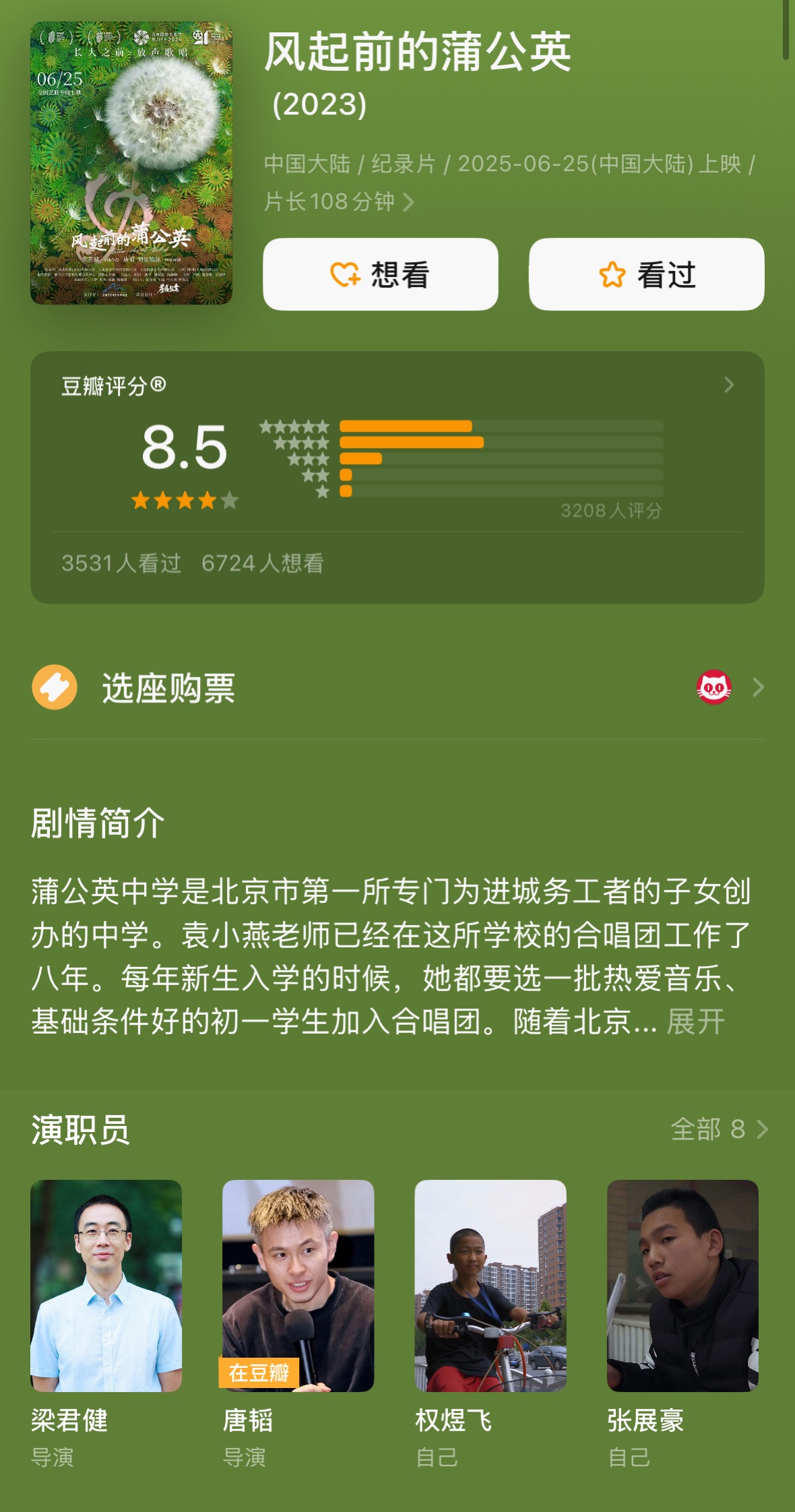 豆瓣目前8.5分,艺联排片已结束,爱奇艺流媒体可线上观看,但我们希望这部影片可以随蒲公英一起飞进每个人的心里。