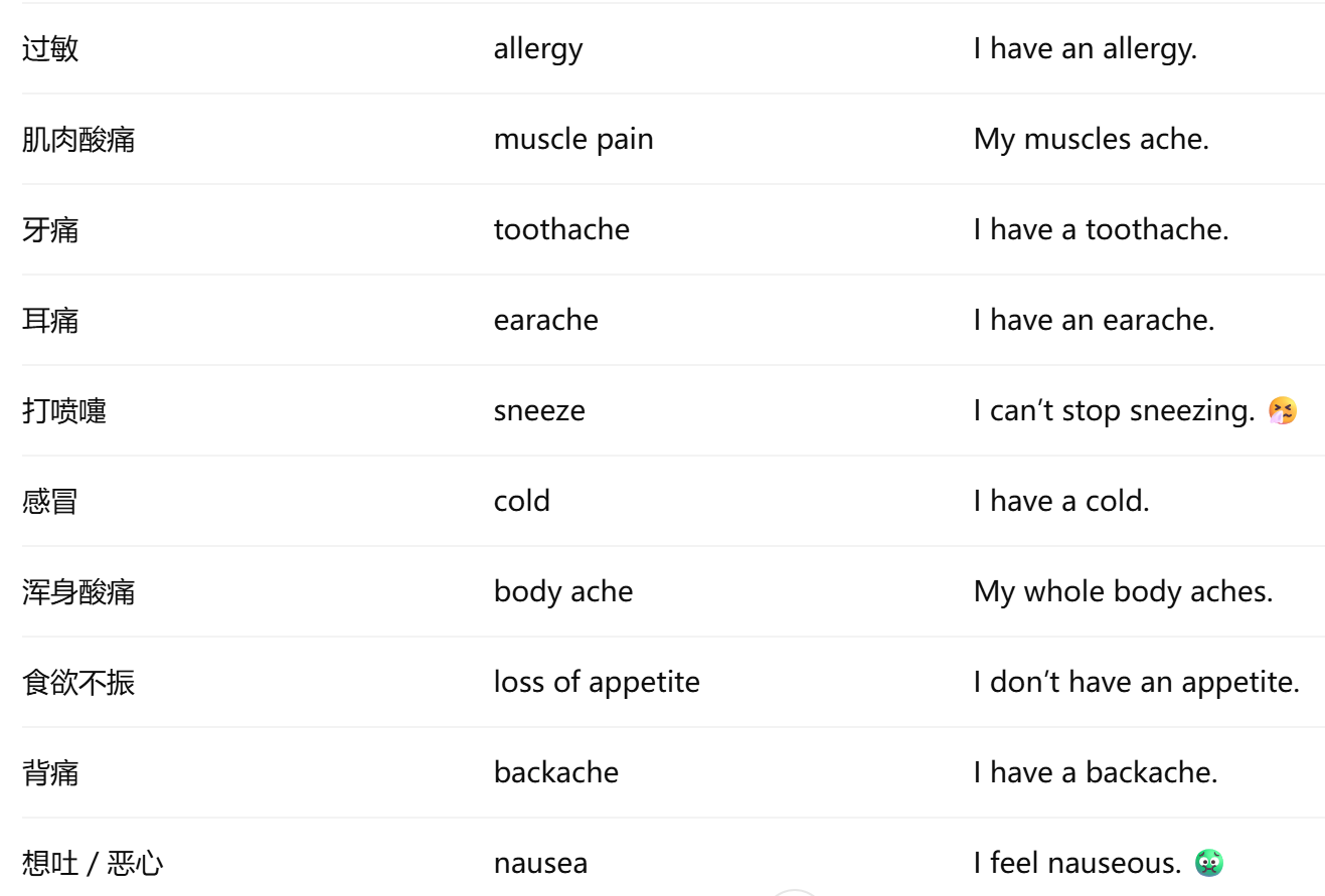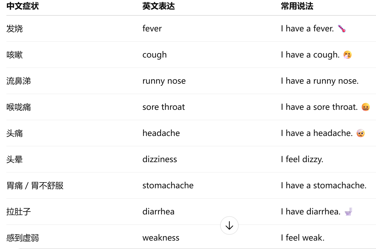 - 表达症状时常用 I have + 症状 或 I feel + 感受。