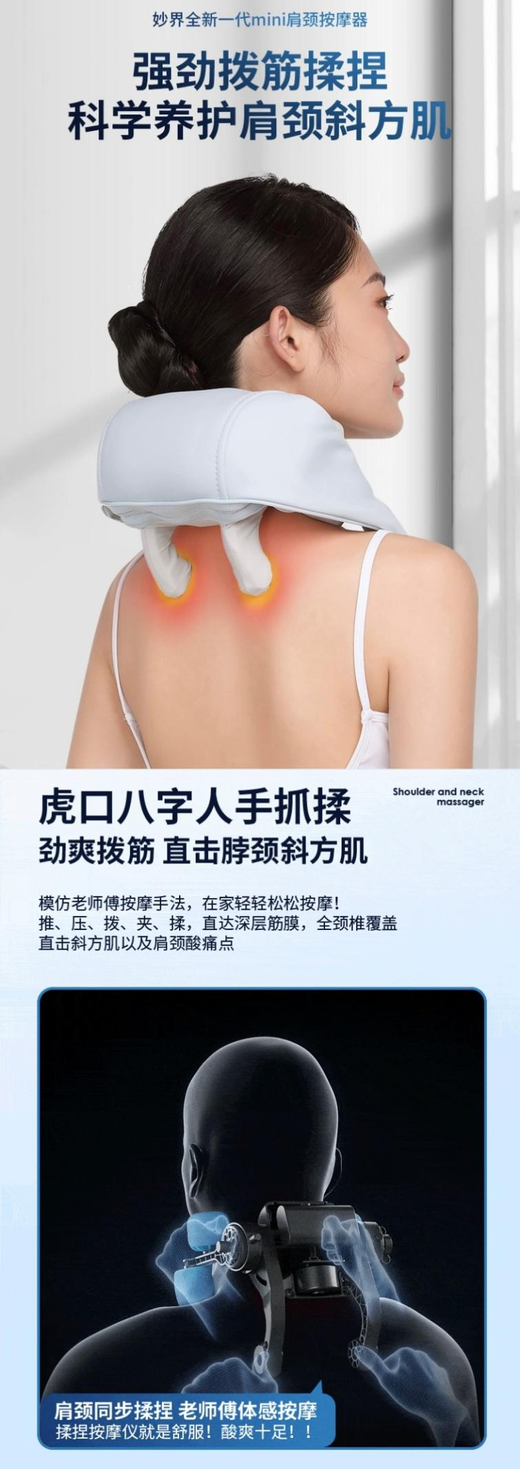 长时间伏案工作肩颈又酸又疼,不知不觉中斜方肌已坚硬如铁……太好了是妙界R3mini肩颈按摩仪,我们有救了!