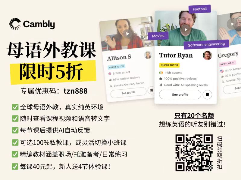 获取方式:扫描下图二维码,或者下载Cambly APP输入推荐码【tzn888】