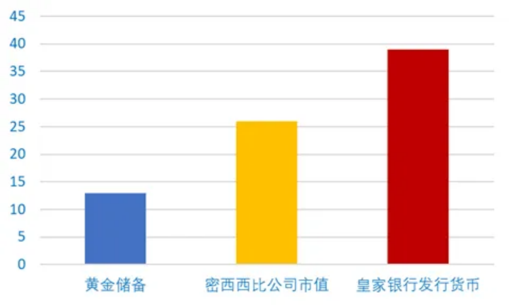 法国密西西比泡沫时期国家黄金储备、公司市值及货币发行量对比: