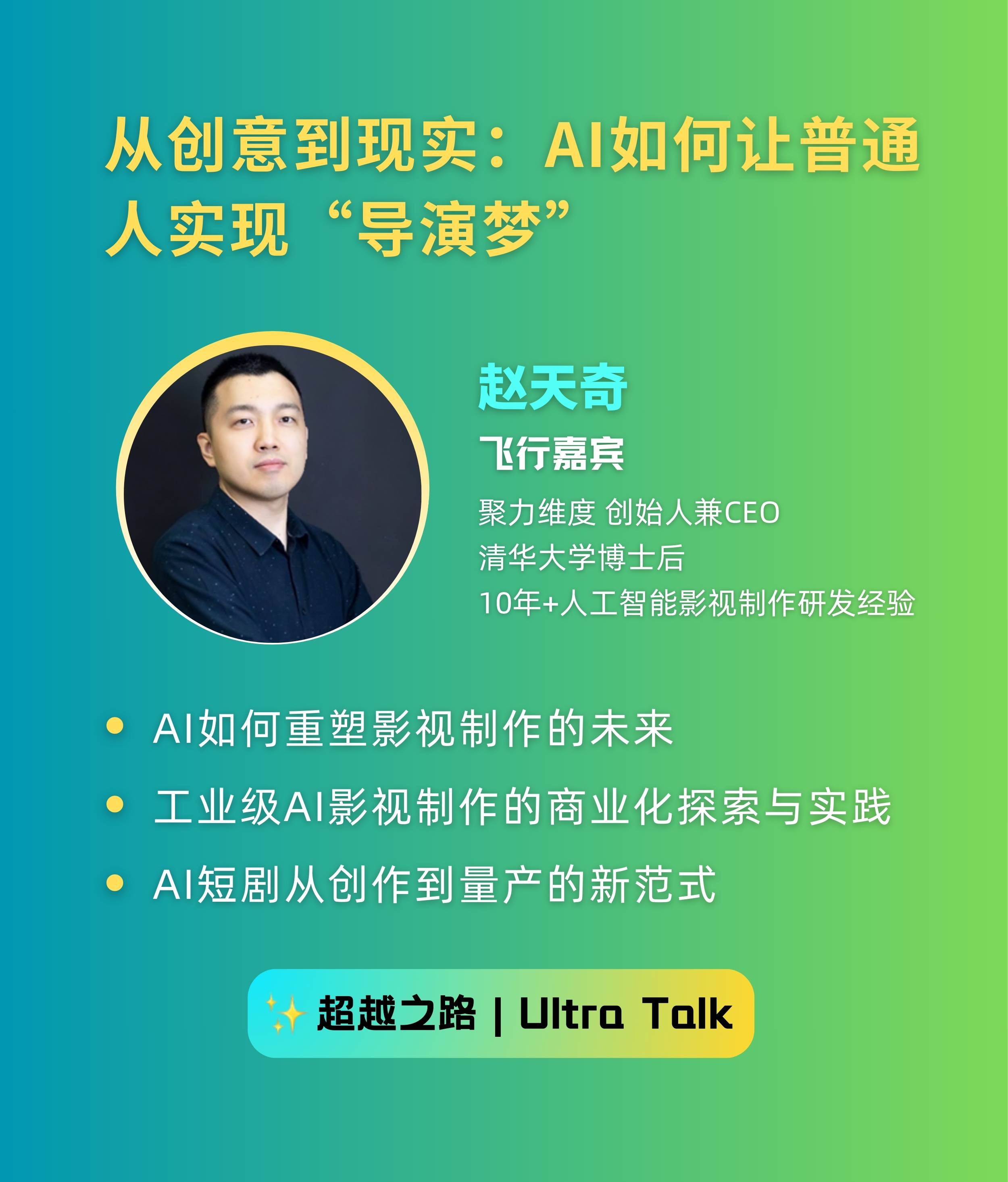 在本期交流中,我们围绕「从创意到现实:AI如何让普通人实现“导演梦”」与赵天奇深入探讨了AI如何重塑影视制作的未来、工业级AI影视制作的商业化探索与实践、AI短剧从创作到量产的新范式等话题。