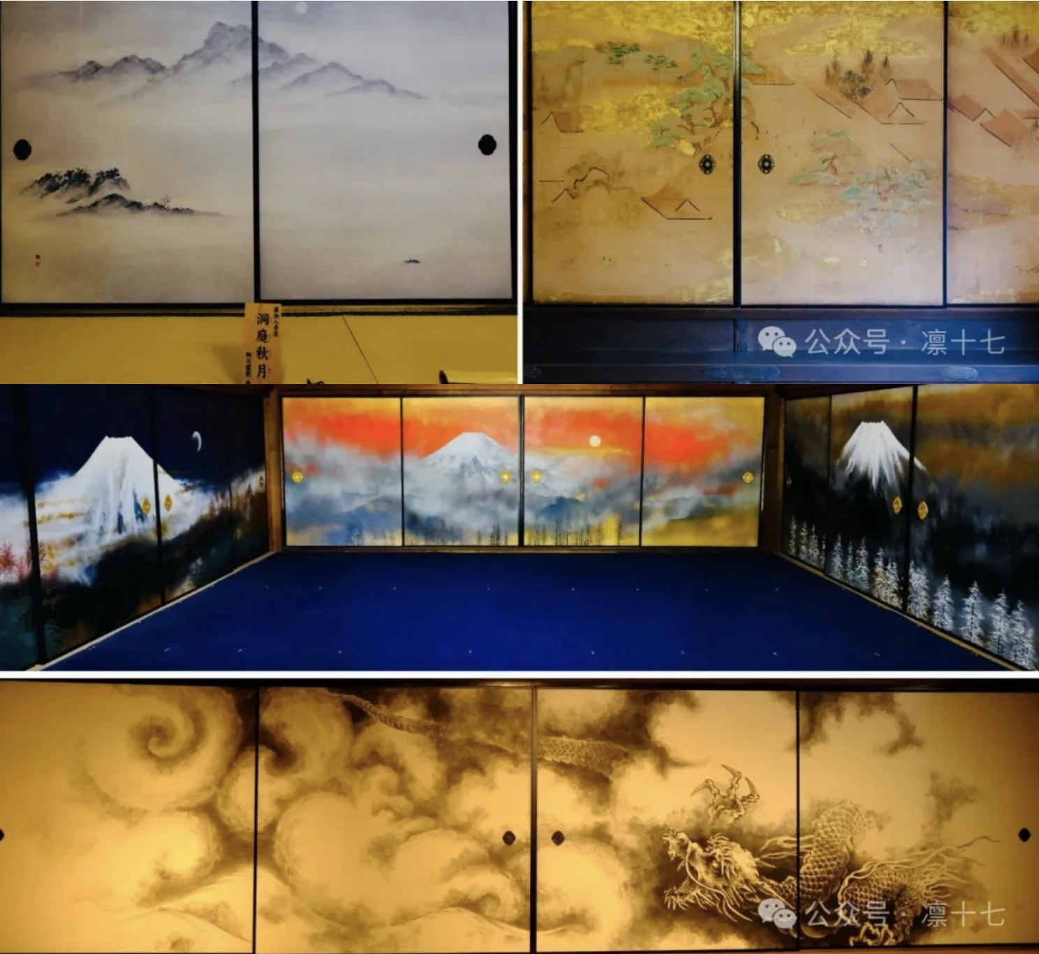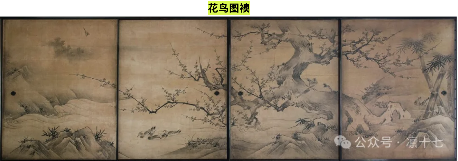 00:16:14:展品四「花鸟图襖」——中日汉字同字不同音的襖,发展出了成为中式水墨画在日式隔扇的襖绘形态(附上京都龙安寺、建仁寺、青莲院等室内襖绘作为参考)