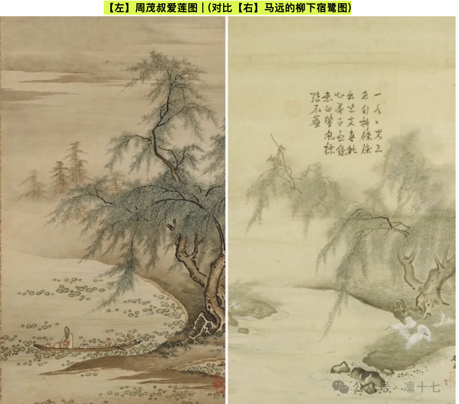 00:11:01:展品一「周茂叔爱莲图」——狩野派第一代狩野元信唯一一幅传世的国宝级别作品,却与马远的《柳下宿鹭图》拥有“同款柳树”
