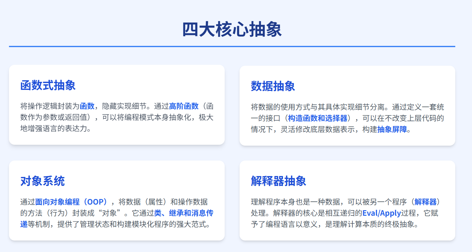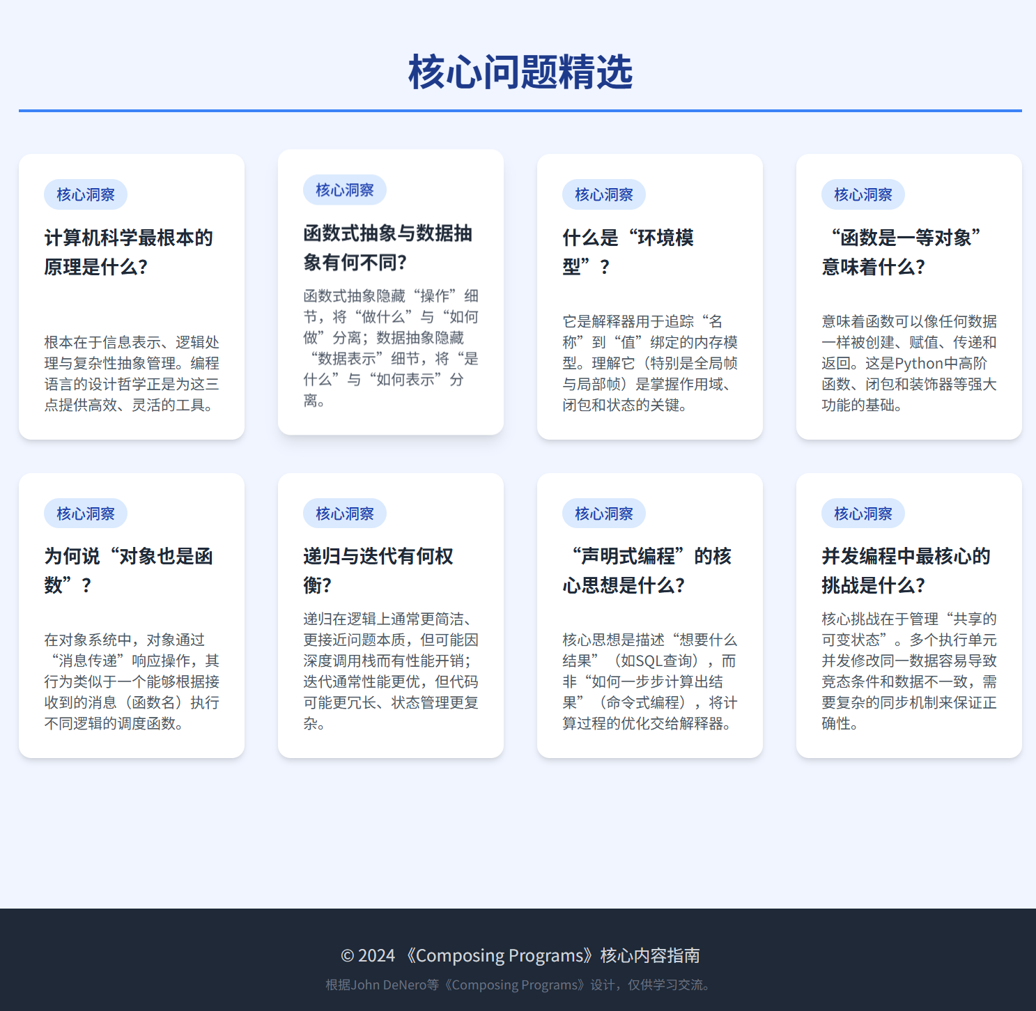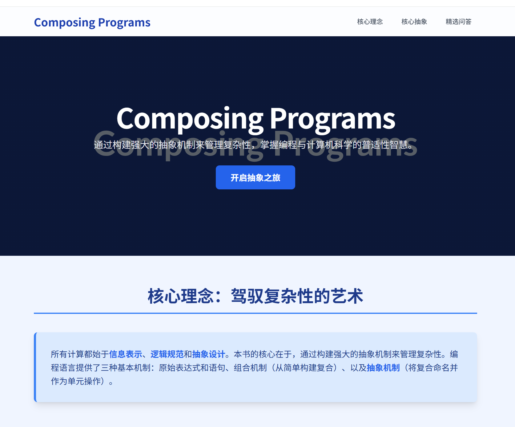 《Composing Programs》是一本旨在向读者介绍编程和计算机科学概念的免费在线教材,特别强调抽象方法、编程范式以及管理大型程序复杂性的技巧。该书主要通过 Python 3 编程语言来阐释这些核心概念,并辅以编程项目和可视化工具帮助学习者实践。全书结构清晰,分为四个主要章节,从基础的函数、数据、表达式与控制流讲起,深入探讨了对象与数据抽象、解释器设计,并扩展到数据处理、并发与分布式计算等高级主题。它不仅详细讲解了编程语言的机制,还强调了编写人类可读代码的重要性,并引入了测试和调试的实践方法,旨在培养读者构建模块化、可维护且可扩展程序的坚实基础。
