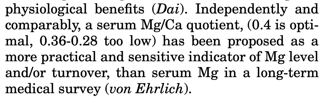 18:58 简便的判断自己是否需要补镁:1. 去消化内科或者去内分泌科让医生开验血单,查血清电解质7项。包含:钠、钾、氯、钙、磷、镁、碳酸氢;2. 用血清镁的数值除以血清钙数值;3. 得到的结果,如果大于0.4就不补;小于0.4就可以补;小于0.36需要恶补。但是血清镁数值本身大于1,那么也不补。这个计算的原理是什么?它来自2016年发布在权威期刊上的文献,具体数字范围部分我引用出来。