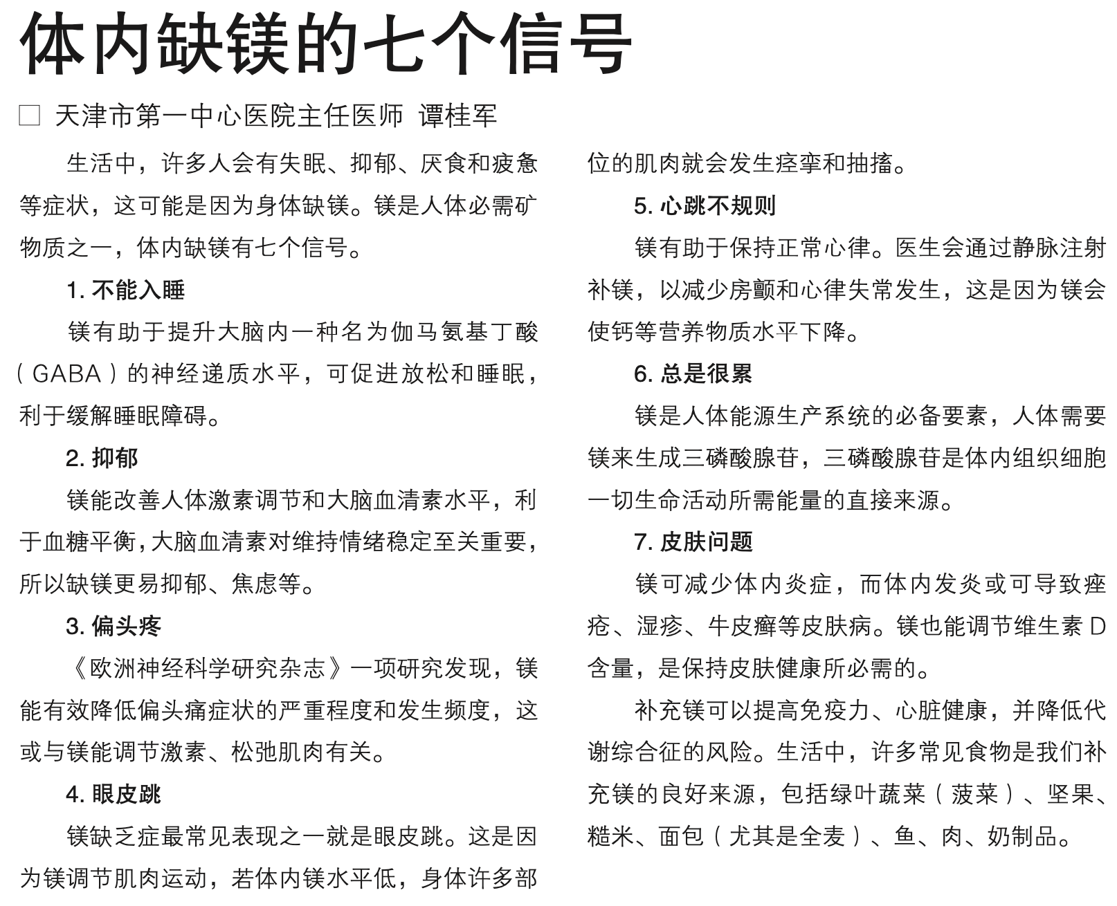 01:07 失眠的同时有哪些问题,可以怀疑自己缺镁?天津市第一中心医院主任医师谭桂军写了一篇医学科普《体内缺镁的7个信号》欢迎👏对照