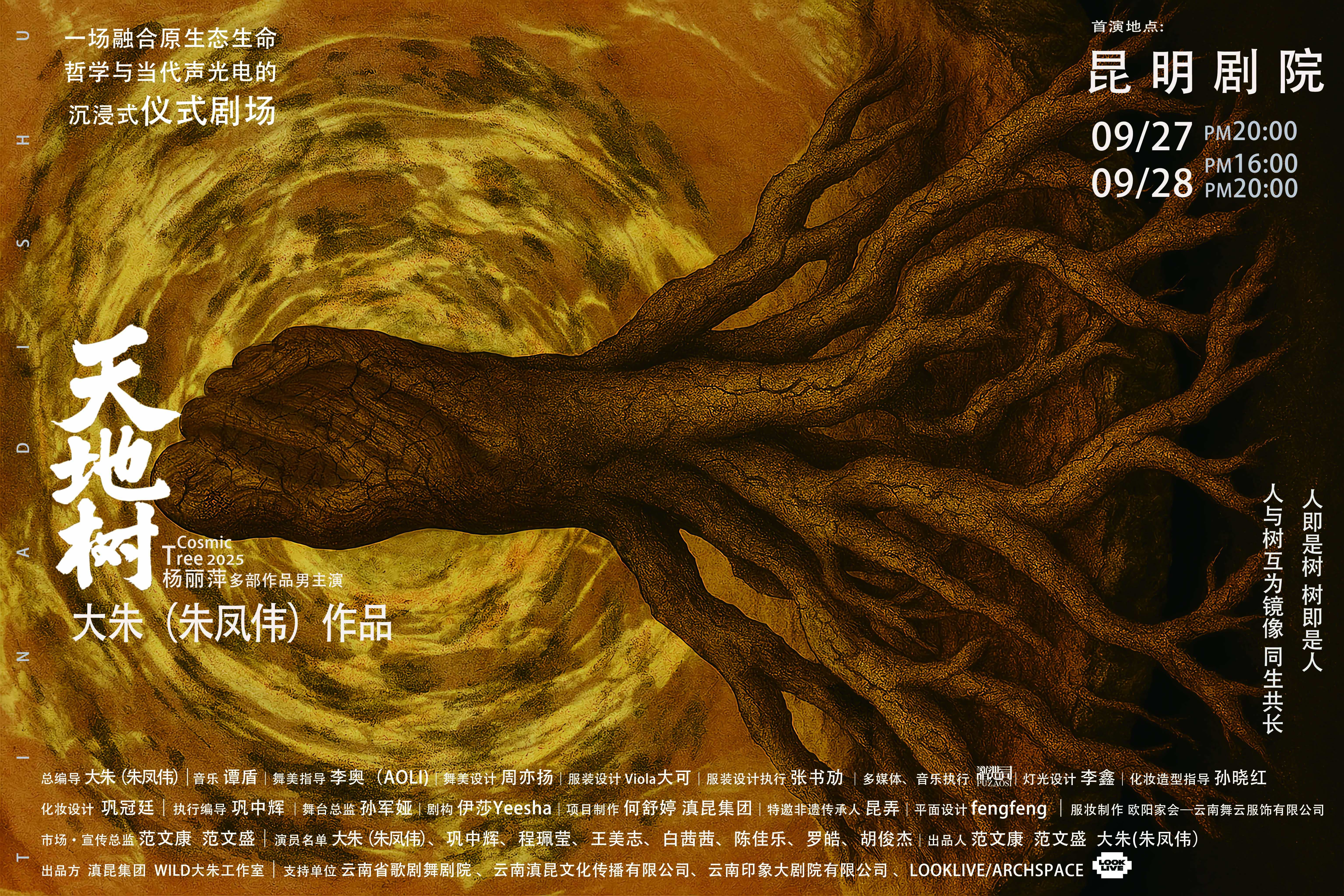 剧目融合生命树的人性、与三星堆“通天神树”人神互通的、与先民祭祀相关的神性,以东方”三才”宇宙观为哲学基底,将一棵树的不同层级——树冠、树根、树干分别指代天、地、人“三才”三重维度。“树”作为贯穿整个舞台的轴心——既是具象的生命载体,又是抽象宏大、连接天地的宇宙通道,所有道具皆由其生发,所有故事皆绕其流转。