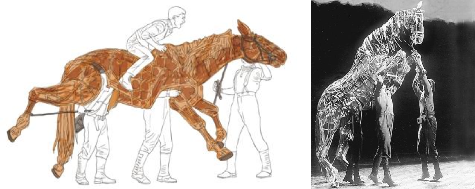 ▼ 舞台剧《战马》的偶(马偶由三位操偶师操纵)