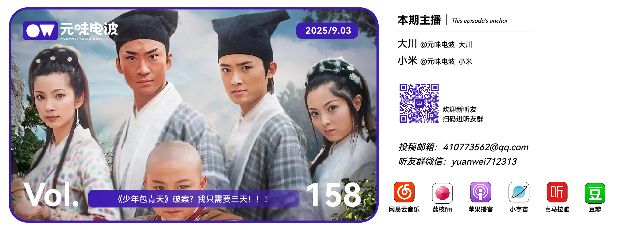 我们的节目,您可以在小宇宙、喜马拉雅、网易云音乐、荔枝 FM、荔枝播客,苹果播客,豆瓣书影音,微博搜索「元味电波」来订阅、收听。如果喜欢我们,也可以分享给你身边的朋友!