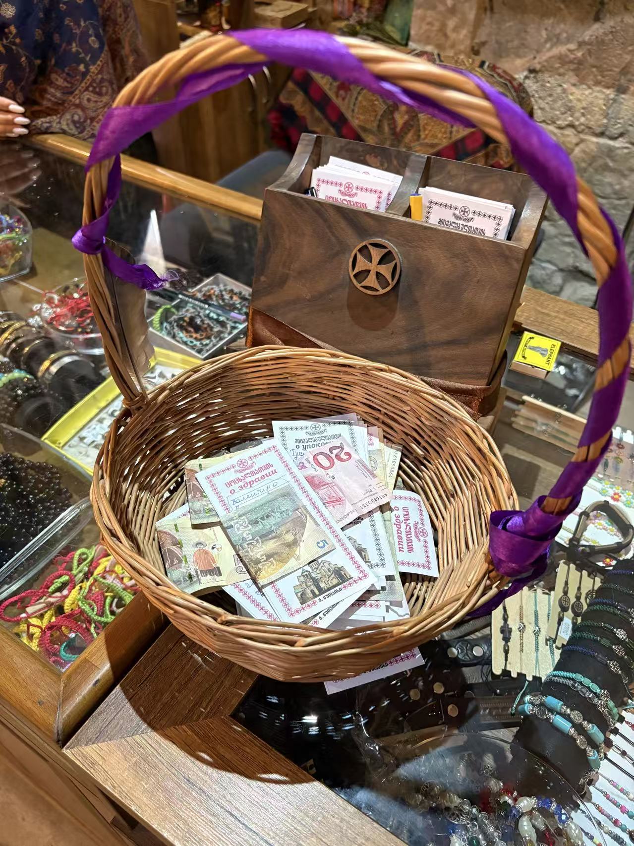 【教堂里用来捐款的小篮子】把自己的名字写在纸上,然后把钱折起来夹在纸上,最后放在篮子里(男性和女性写名字的纸,颜色不一样)