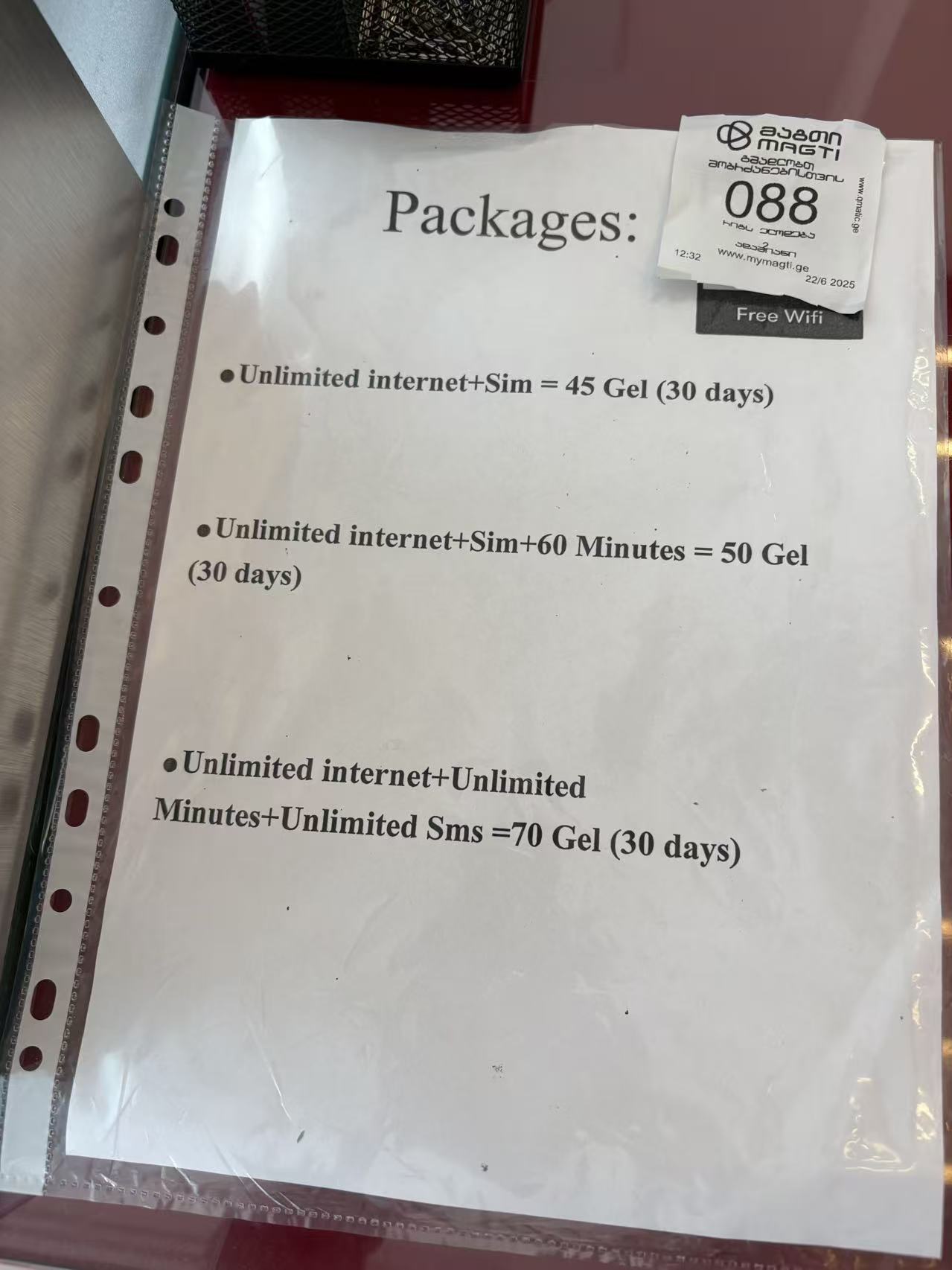【MagtiCom提供的游客套餐】推荐第2个套餐:30天不限流量+60分钟通话,50拉里相当于人民币130。