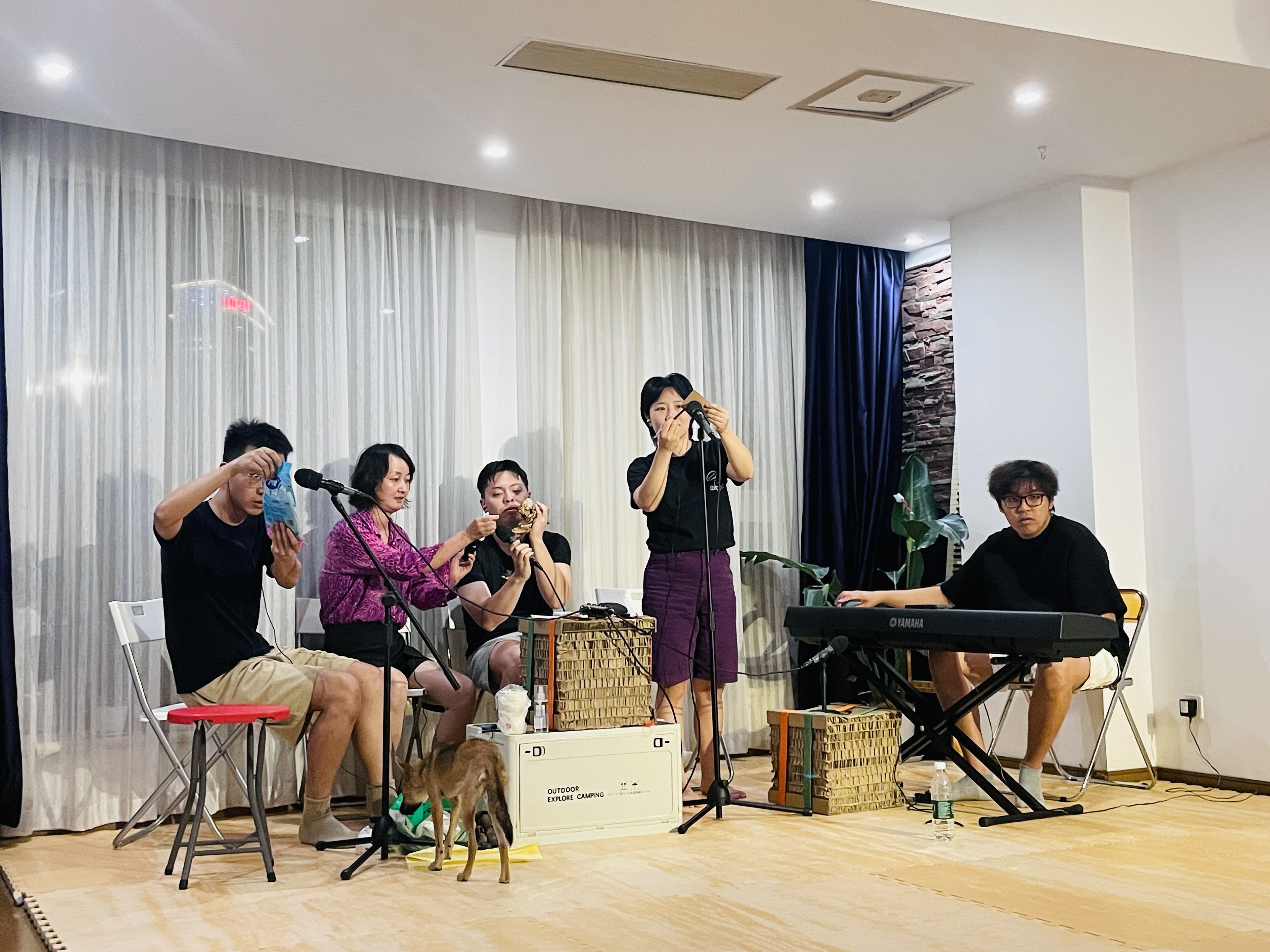 (图1:演员们即兴地玩着各式物件,乐师则在一旁配合着)
