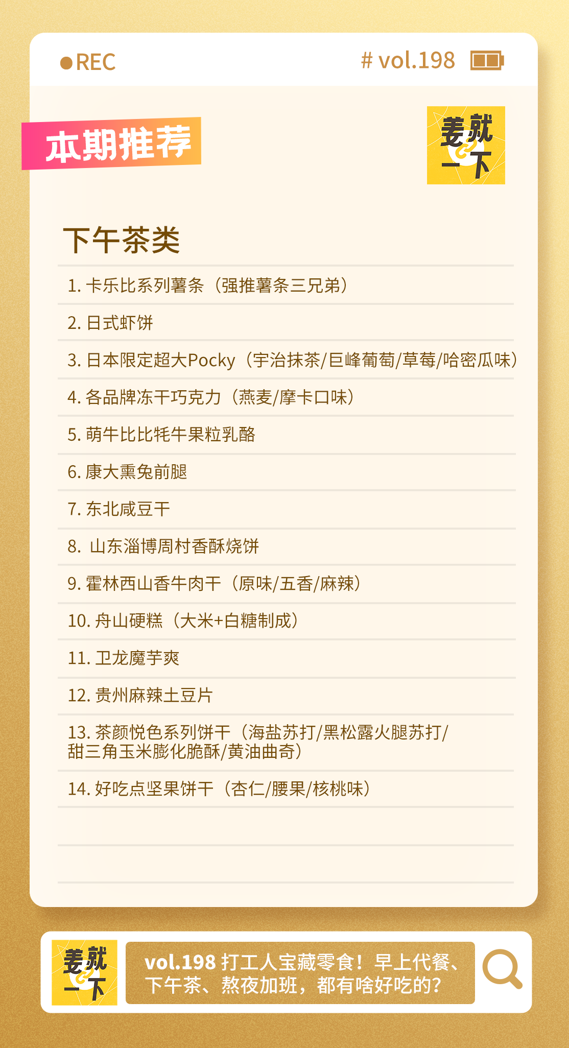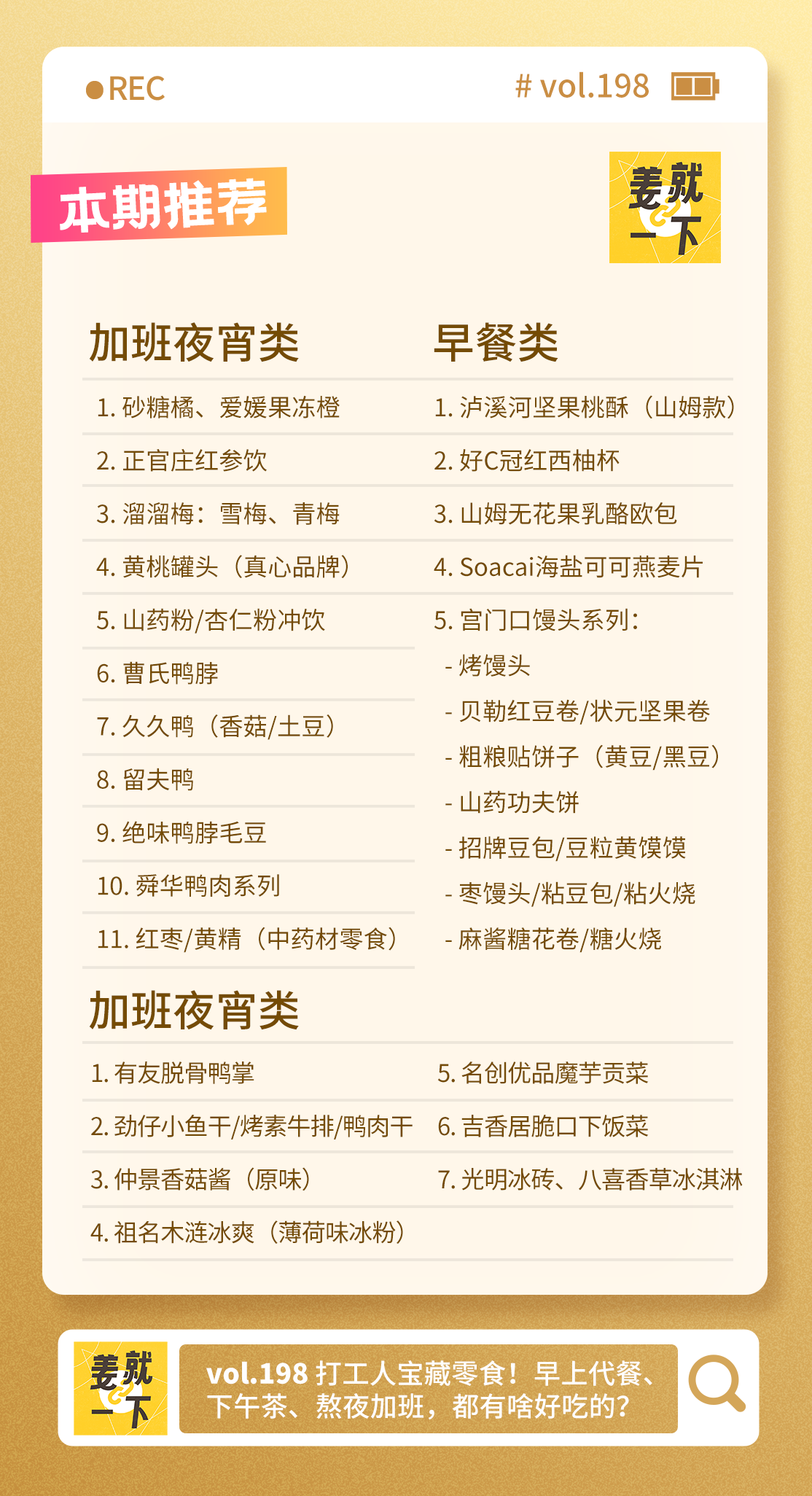 本期串台《姜就一下》,聊聊上班可以吃的零食,涵盖早饭垫一口、下午摸鱼好零食、晚上加班补充能量等多种场景。