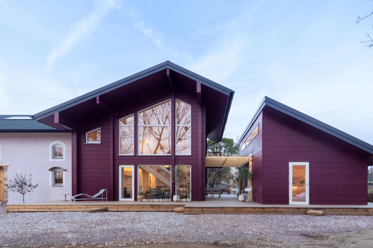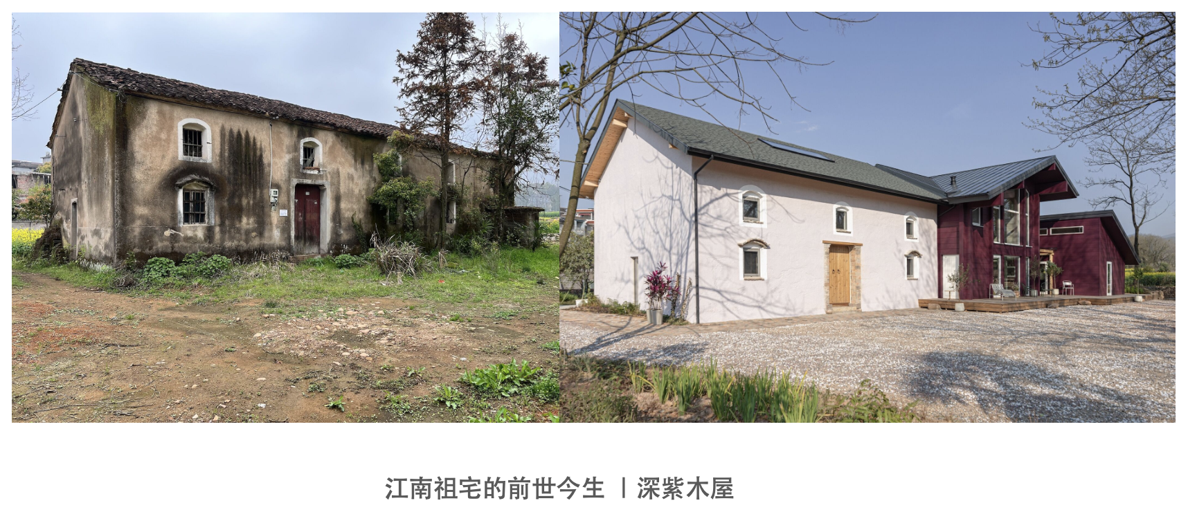 - 江南祖宅·深紫木屋:老宅改造 + 现代木结构扩建;主屋 + 柴房式餐厨;书墙贯通至卧室“美人靠”
