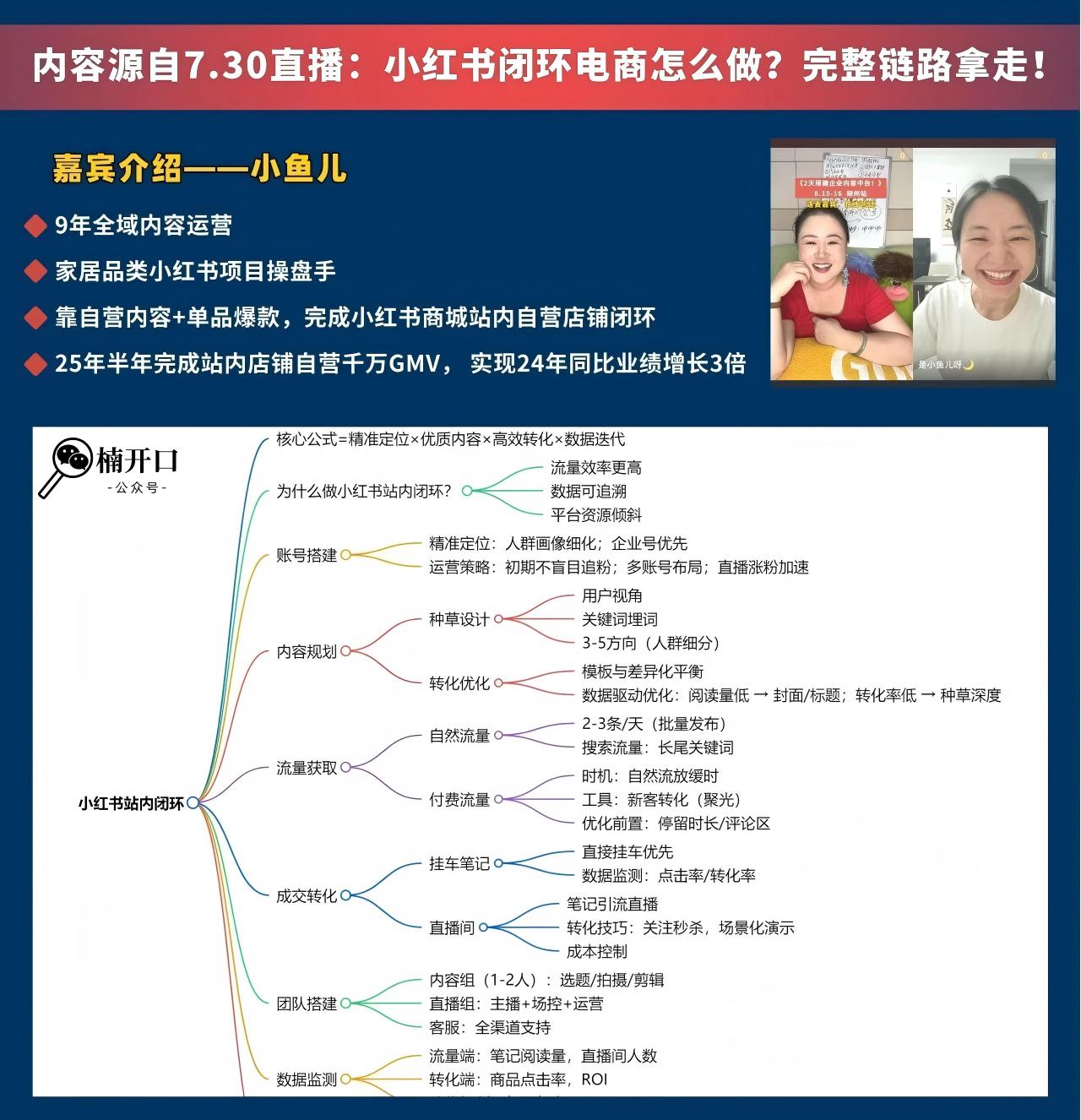 7月30日,我们邀请了1位半年内带领家居品牌在小红书站内做到千万销售额的操盘手-小鱼儿 ,做客我们楠开口的直播间,分享了她的实战经验。